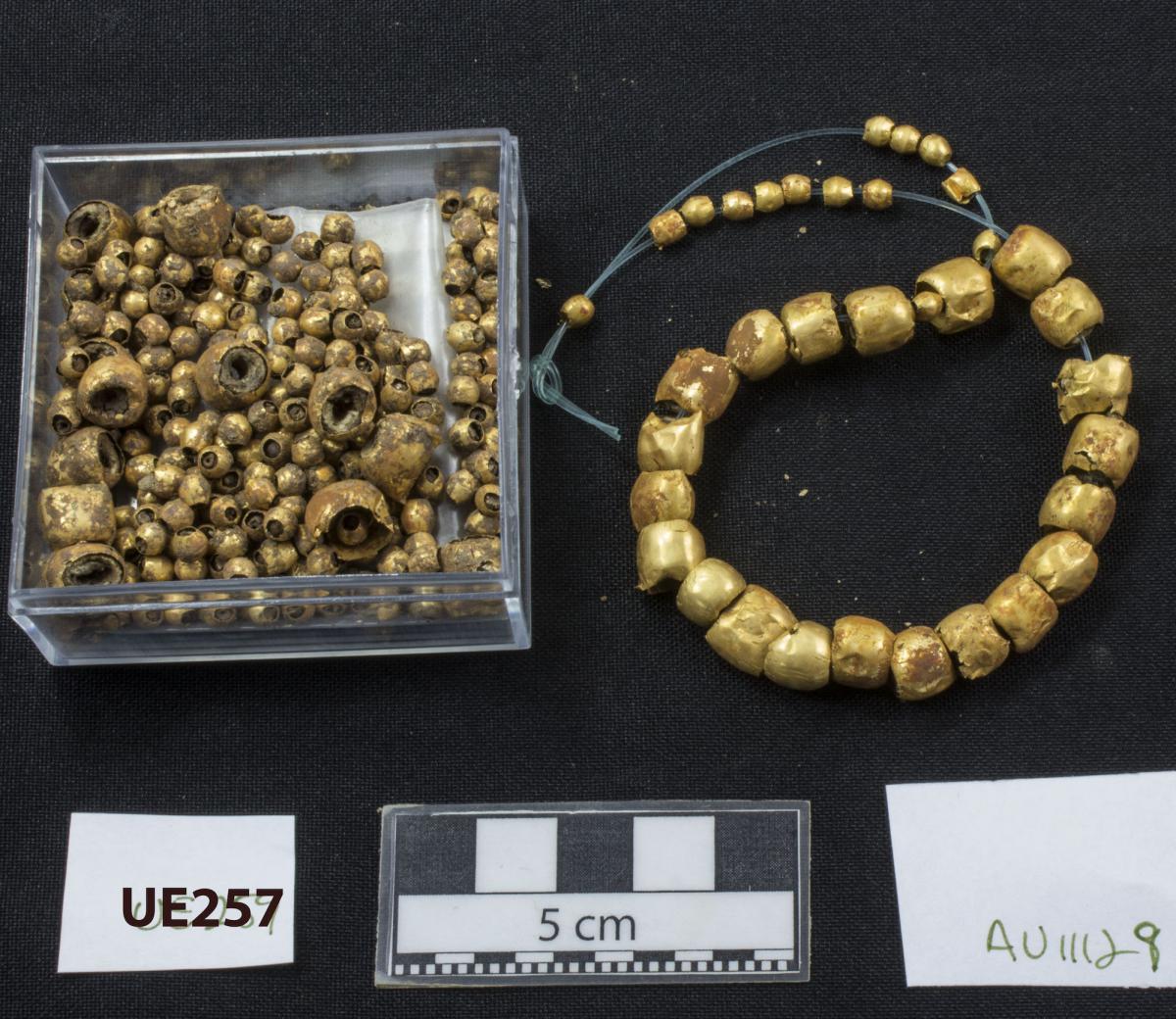 Commentary:  Control photo of the EU257 offering. The offering consists of cuffs (at least 2), at least one tumbaga plaque, and a necklace of wax beads with gold casings. These artifacts are similar to those worn by the high status infant buried in this tomb.
