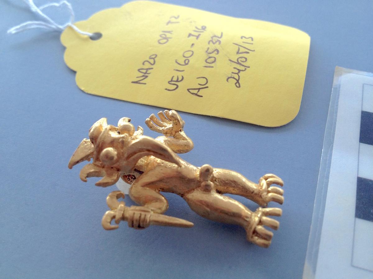 Commentary:  An oblique zenithal view of the cast gold figurative pendant AU10532 representing a naked man in a trance, dressed in a headdress and bird mask. 3.9 x 3 cm. Conte style.
