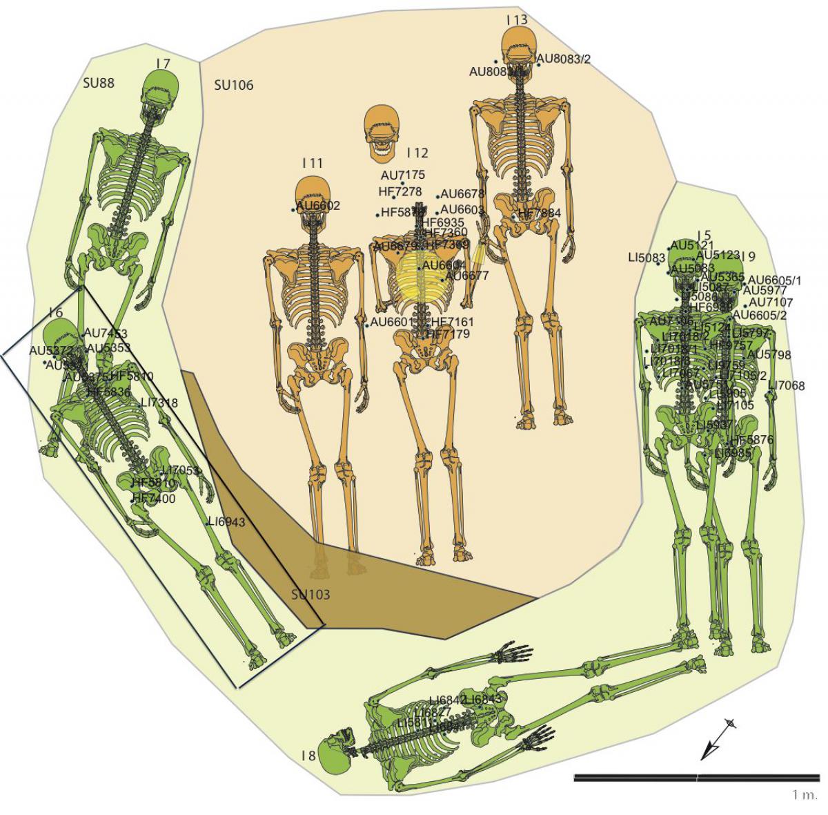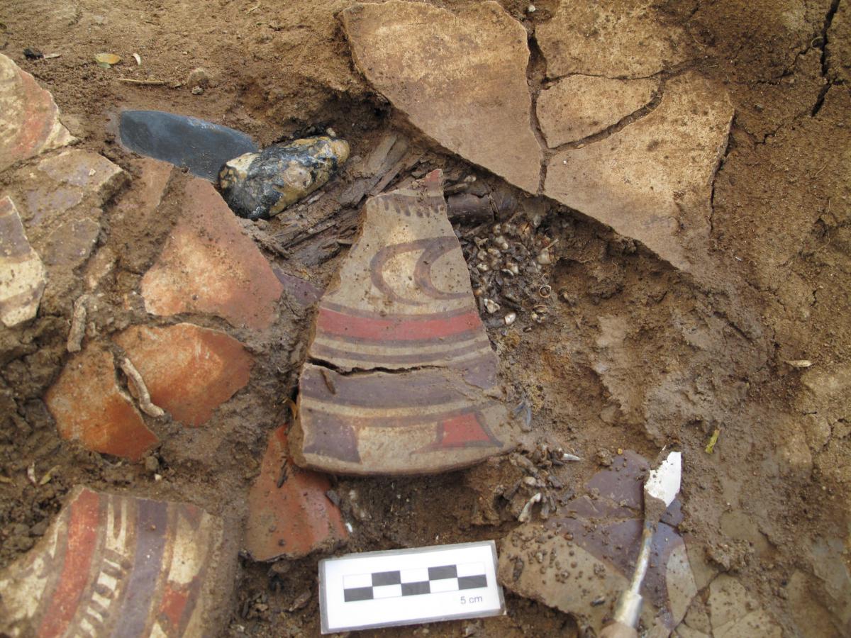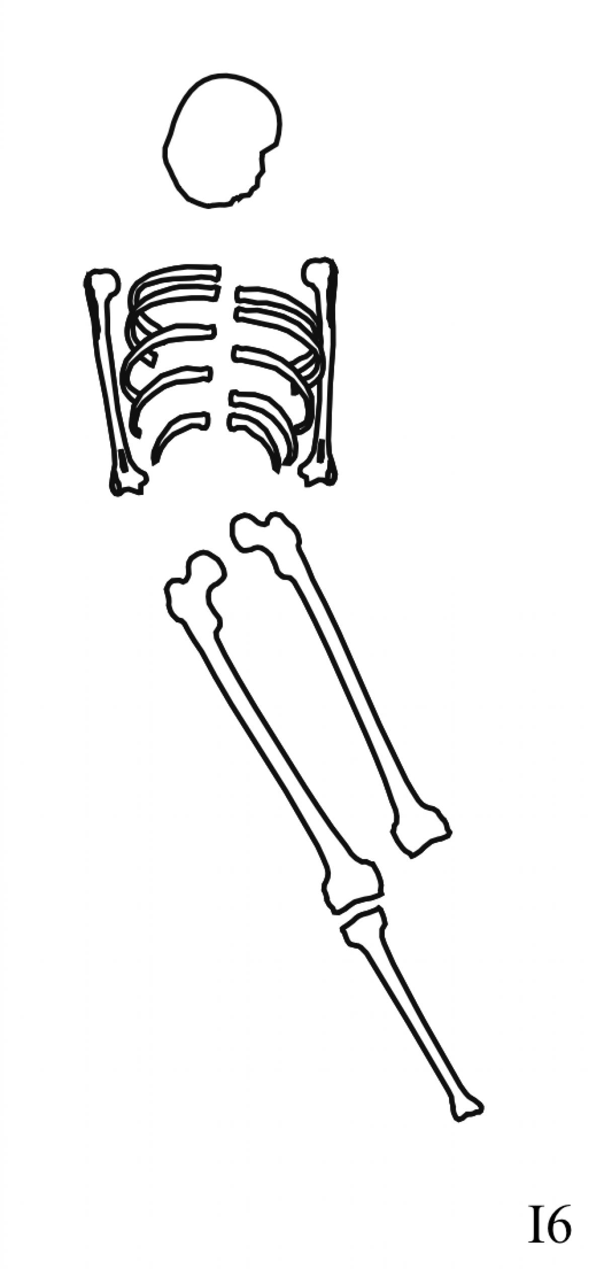 Commentary:  Grave goods of individual I6. The picture shows two polished stone artifacts, the remains of two bone flutes, and an artifact of perforated dog teeth.