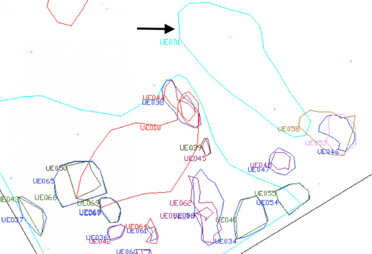 Commentary:  Plan of the area in which unit UE031 was found.