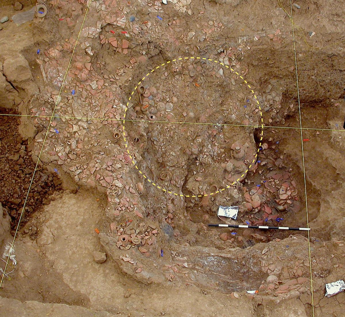 Commentary:  Photograph of unit UE103 in relation to unit UE104. In reality, both units seem to be part of the same structure, the closing of the funerary chamber on the second level of tomb T2.