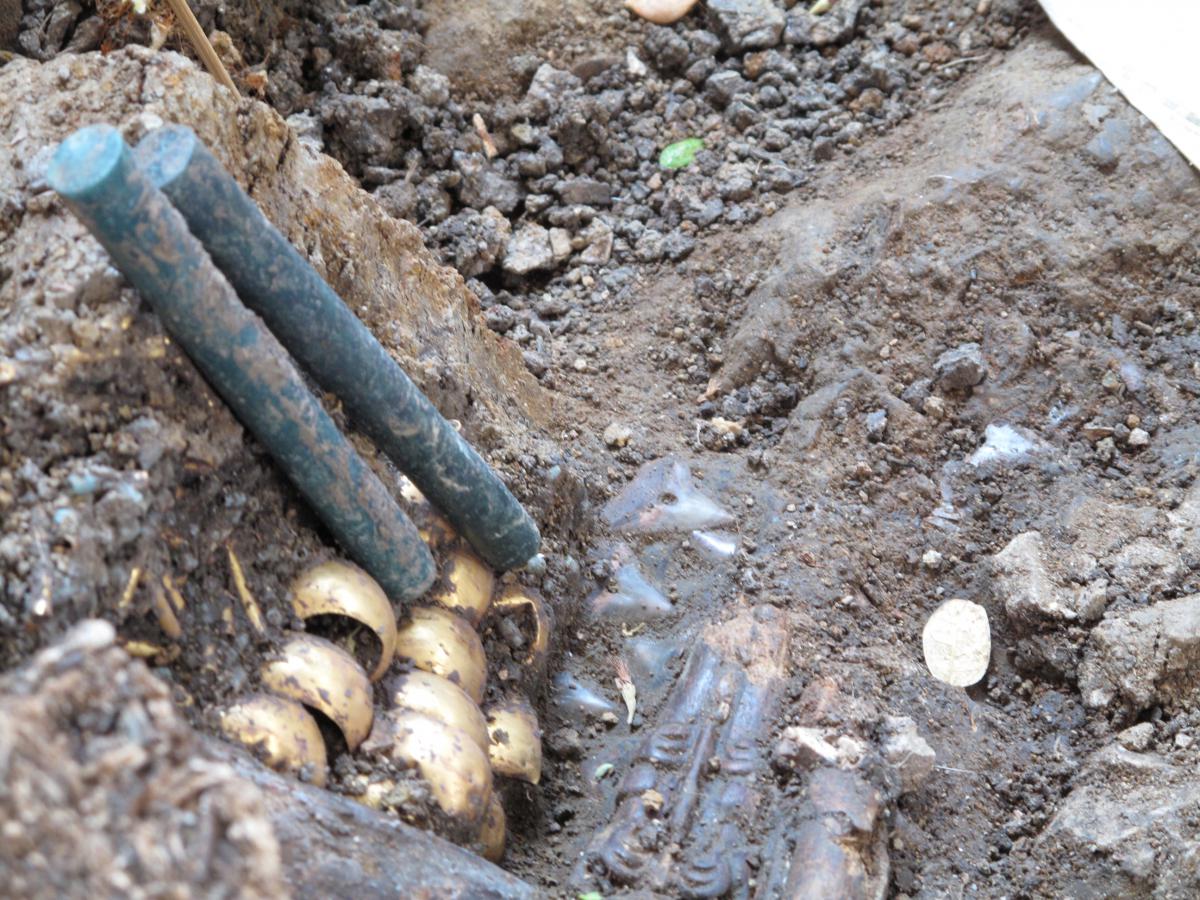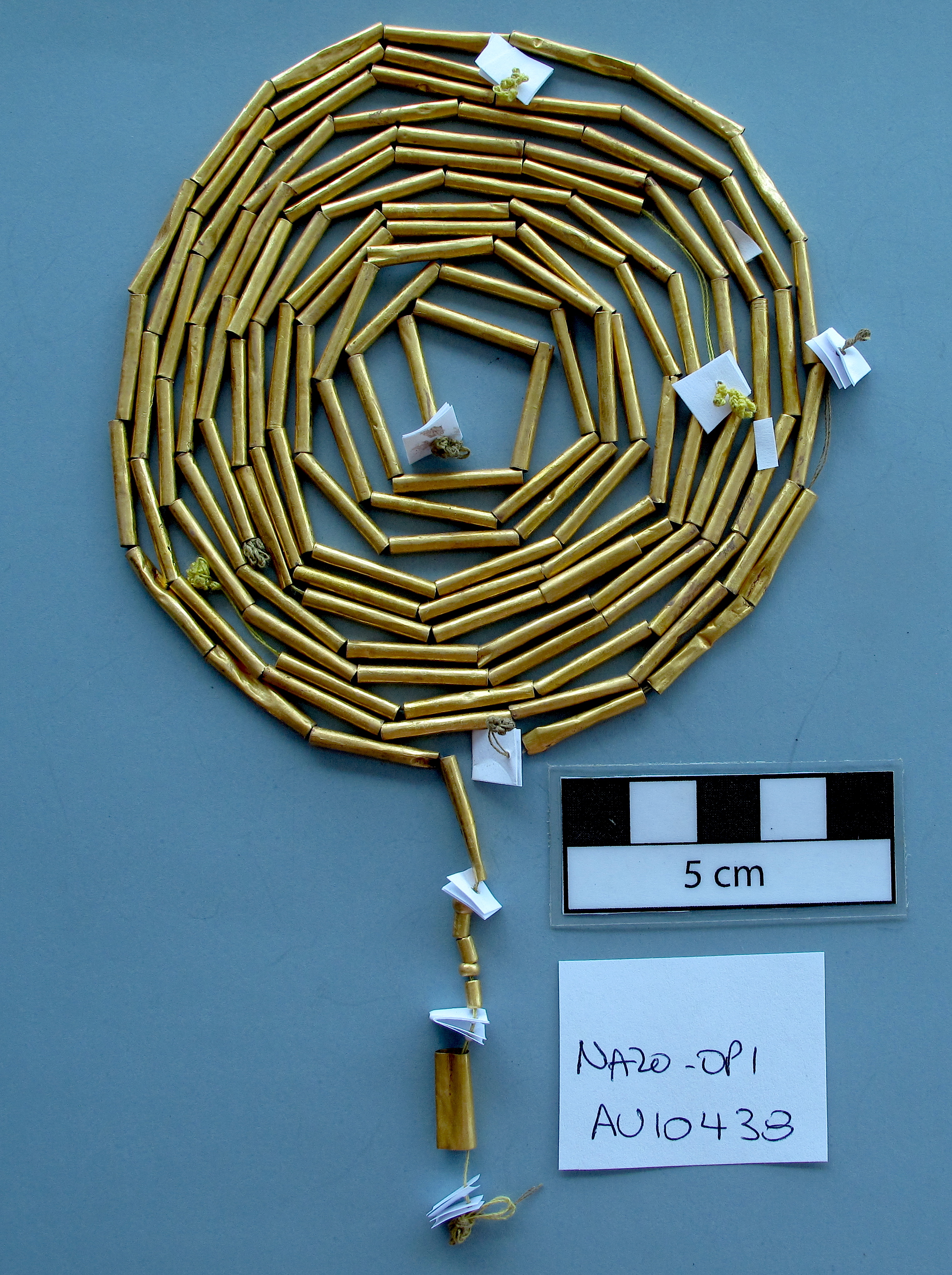 Commentary:  Gold casings of spherical wooden beads. They were probably part of a belt.