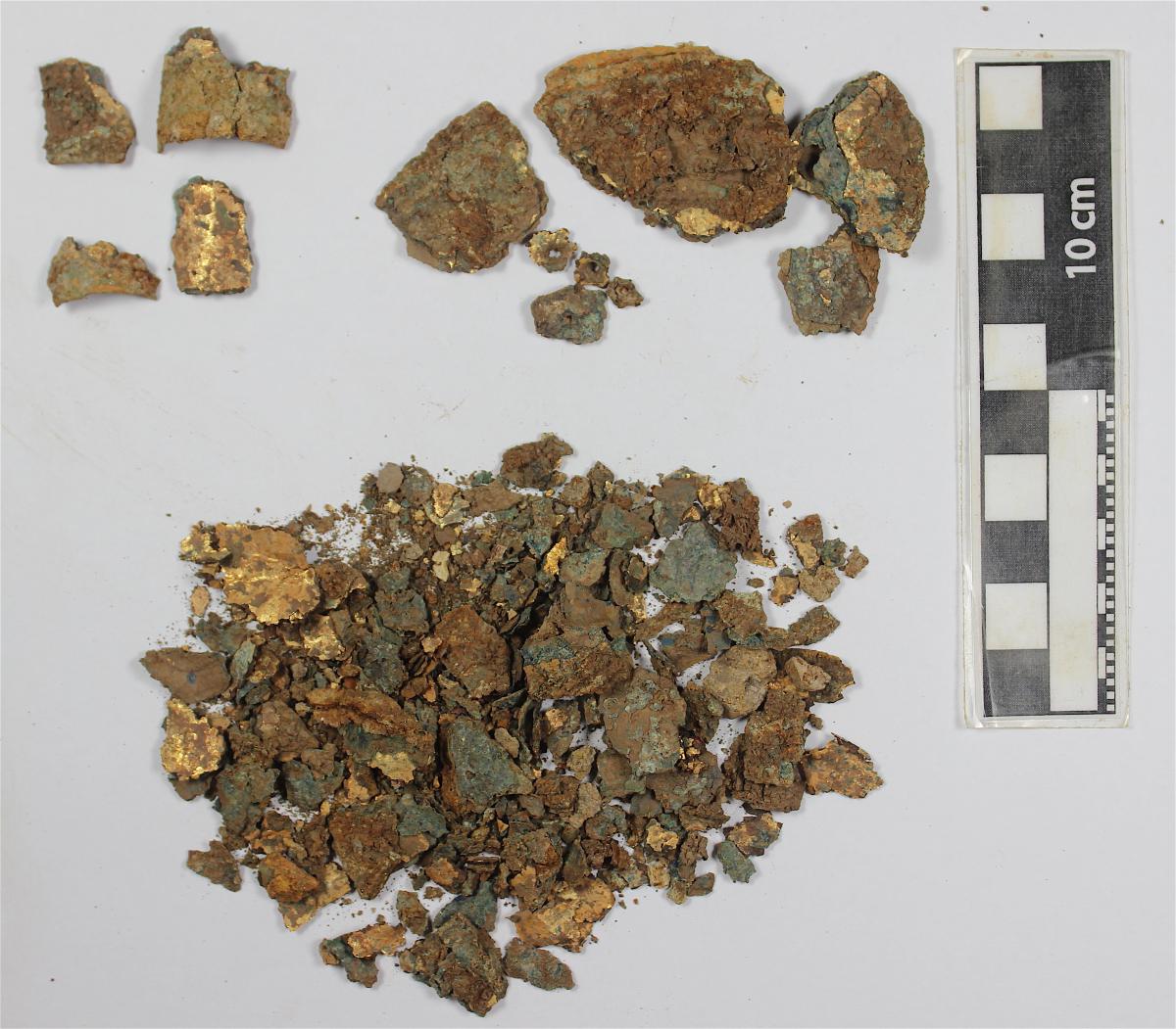 Commentary:  View of the contour of the pectoral. The fragment is very deteriorated. The contour photo shows what could be two pectorals stuck together by copper oxide.
