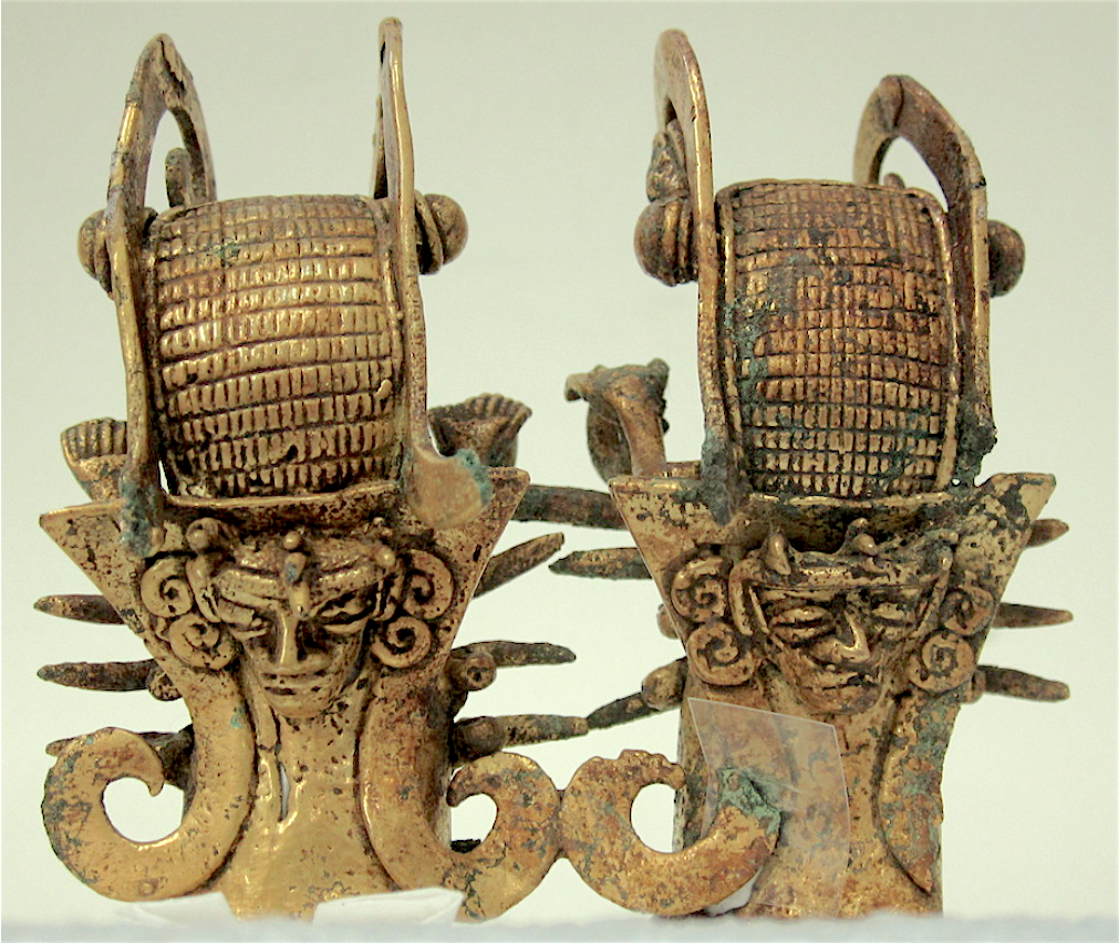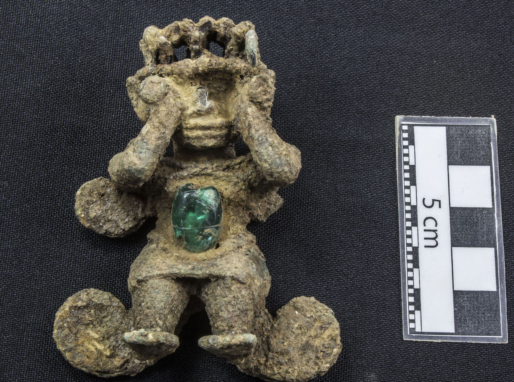 Commentary:  This digital object corresponds to a cast copper pendant representing a ritually dressed human figure who has torn out one eye, and appears to be pulling out the other. This was part of the grave goods of the main individual of tomb T4, and has been interpreted in the text as a sacrificial self-mutilation.