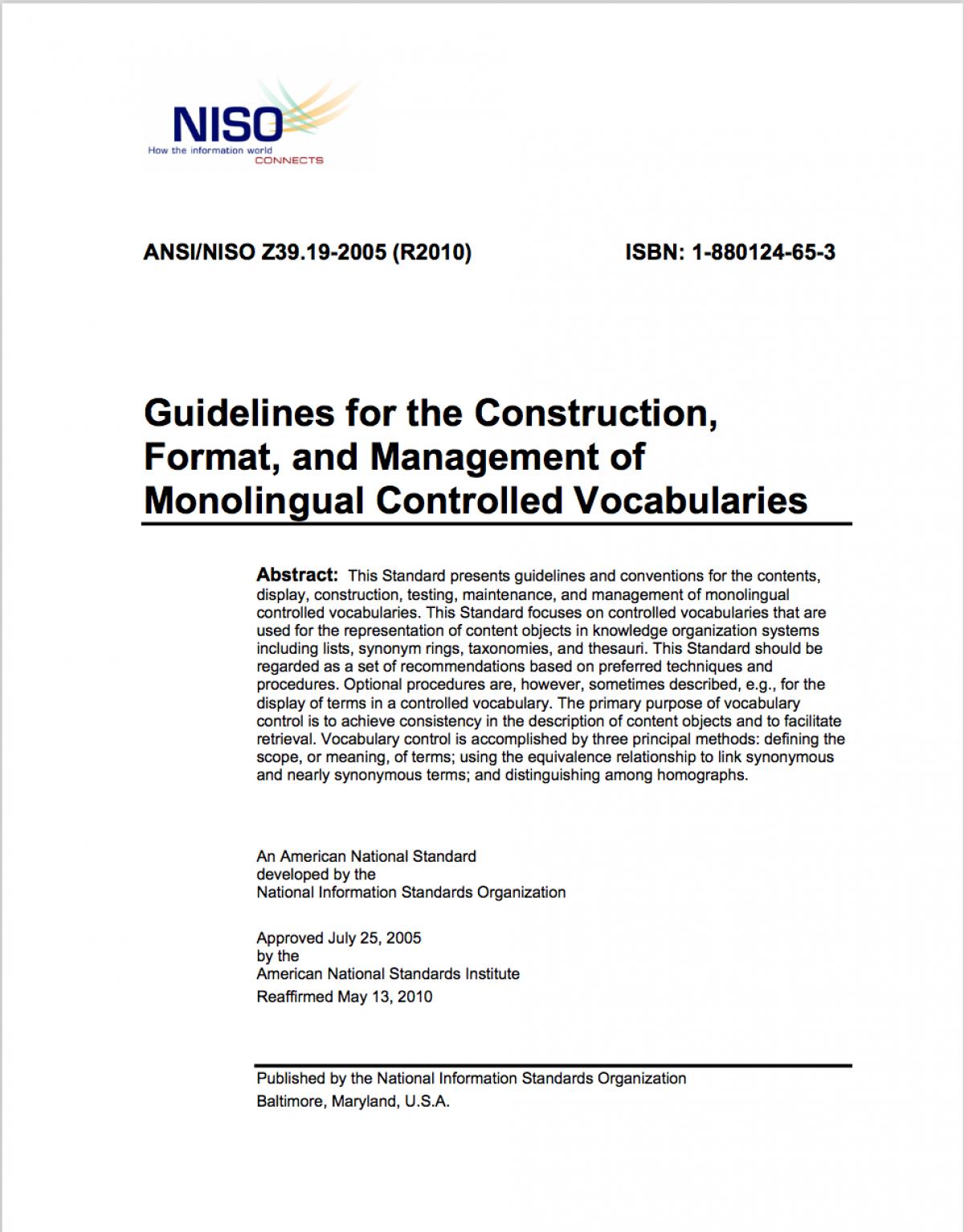 Commentary:  Cover of the NISO (National Information Standards Organization) standard for controlled vocabularies