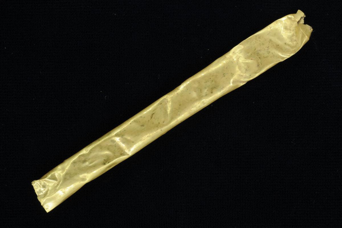 Commentary:  Ear rod associated with individual I12 buried in tomb T2. Part of the unit UE106 (bodies, mortuary ensembles and offerings) slid over the third level of the tomb. That is why some of the mortuary ensembles of the individuals, human bones, and offerings were found in the third level units.