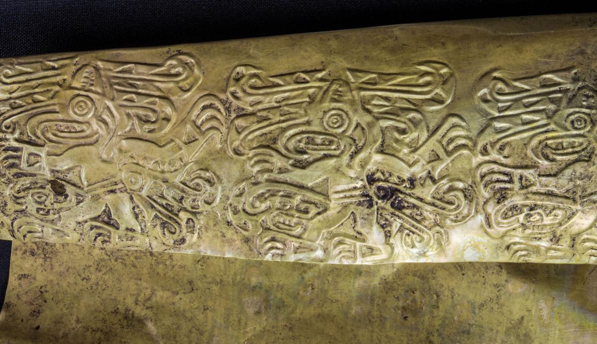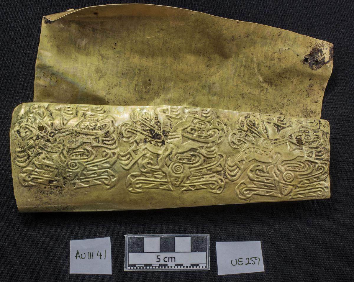387 - Pectoral de oro martillado repujado con la representación frontal del rostro de un ser sobrenatural con rasgos de un anciano que formaba parte del ajuar del Individuo 20, un infante, de la ...