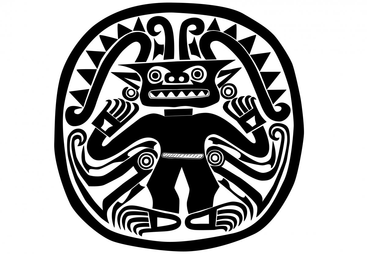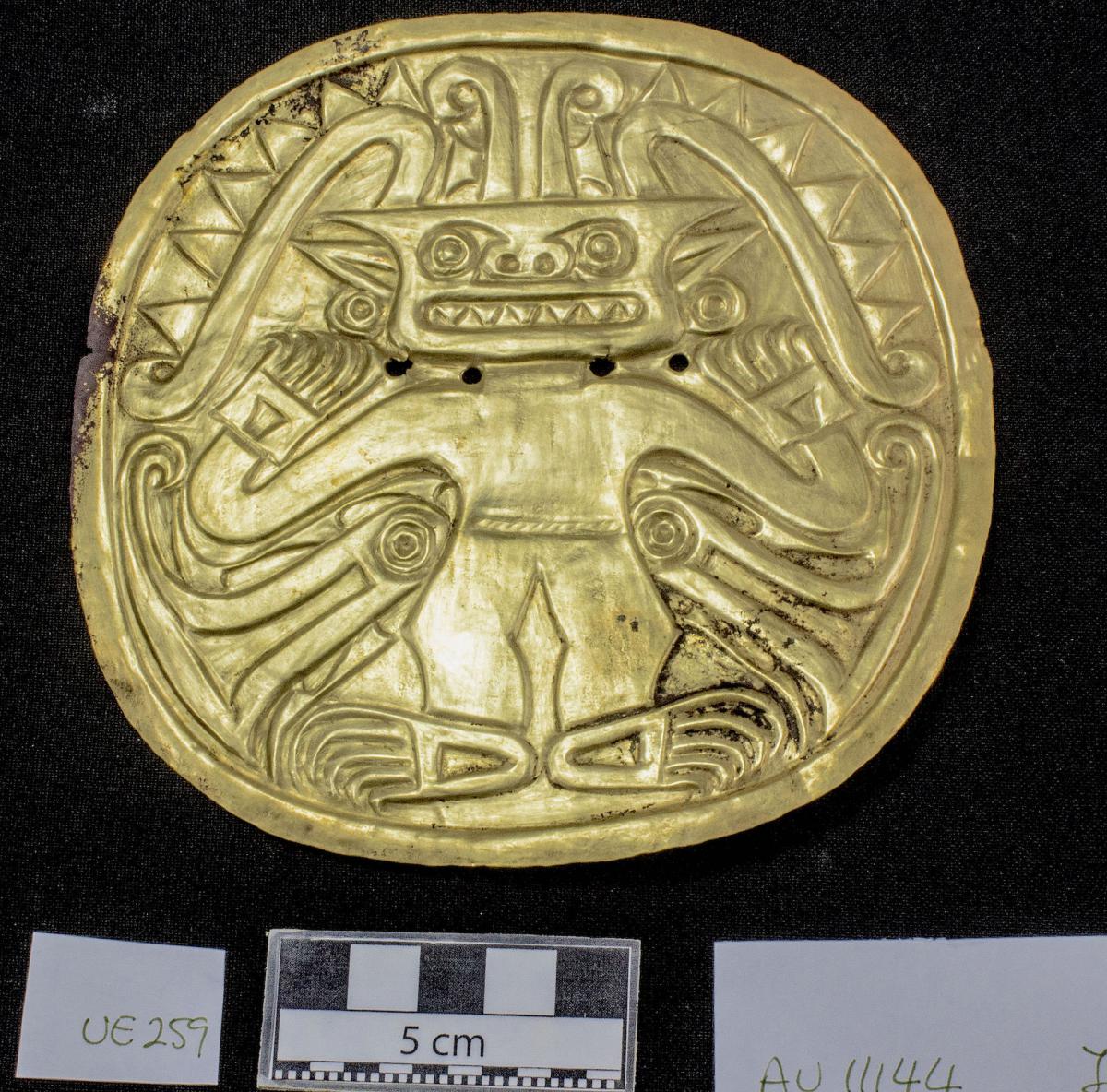 Información del recurso:  Vista anterior del pectoral AU11144 de oro martillado repujado con la visión frontal de un ser sobrenatural antropomorfo personificación del doble cocodrilo mítico. 14,2 x 14,4 cm. Estilo Conte.