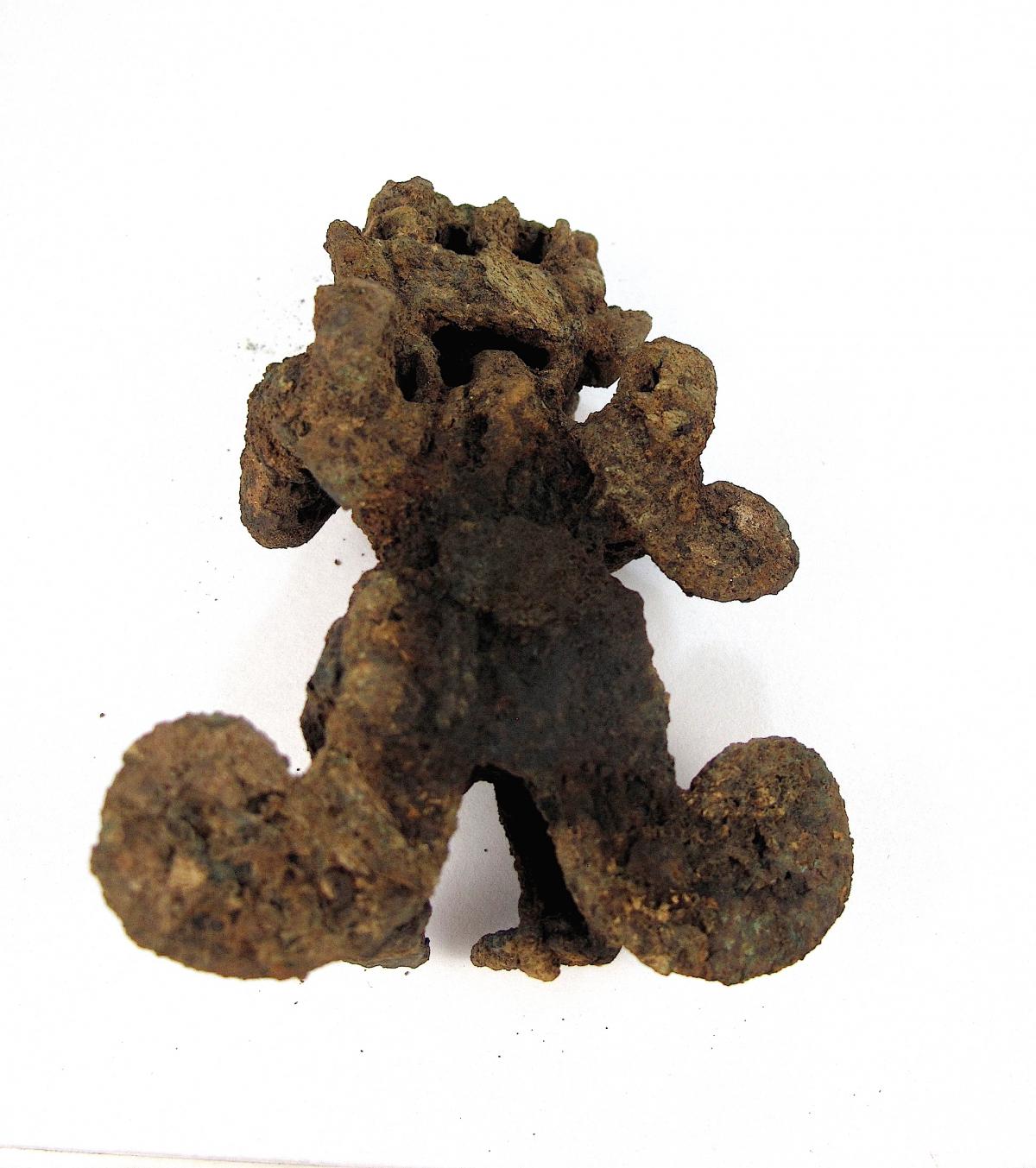 Información del recurso:  Vista traseral del pendiente figurativo de cobre fundido CU11149, que formaba parte del ajuar funerario del individuo principal de la Tumba T4. 7,7x6,3x3,6 cm. Estilo Conte.