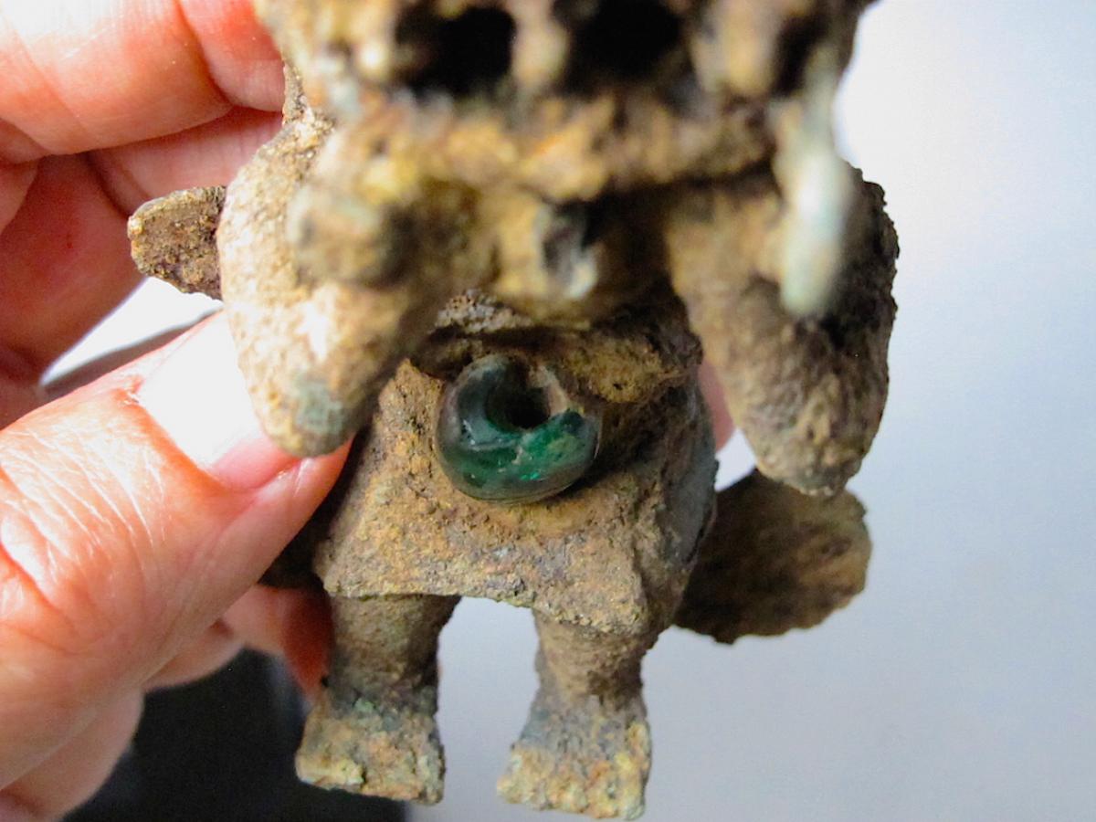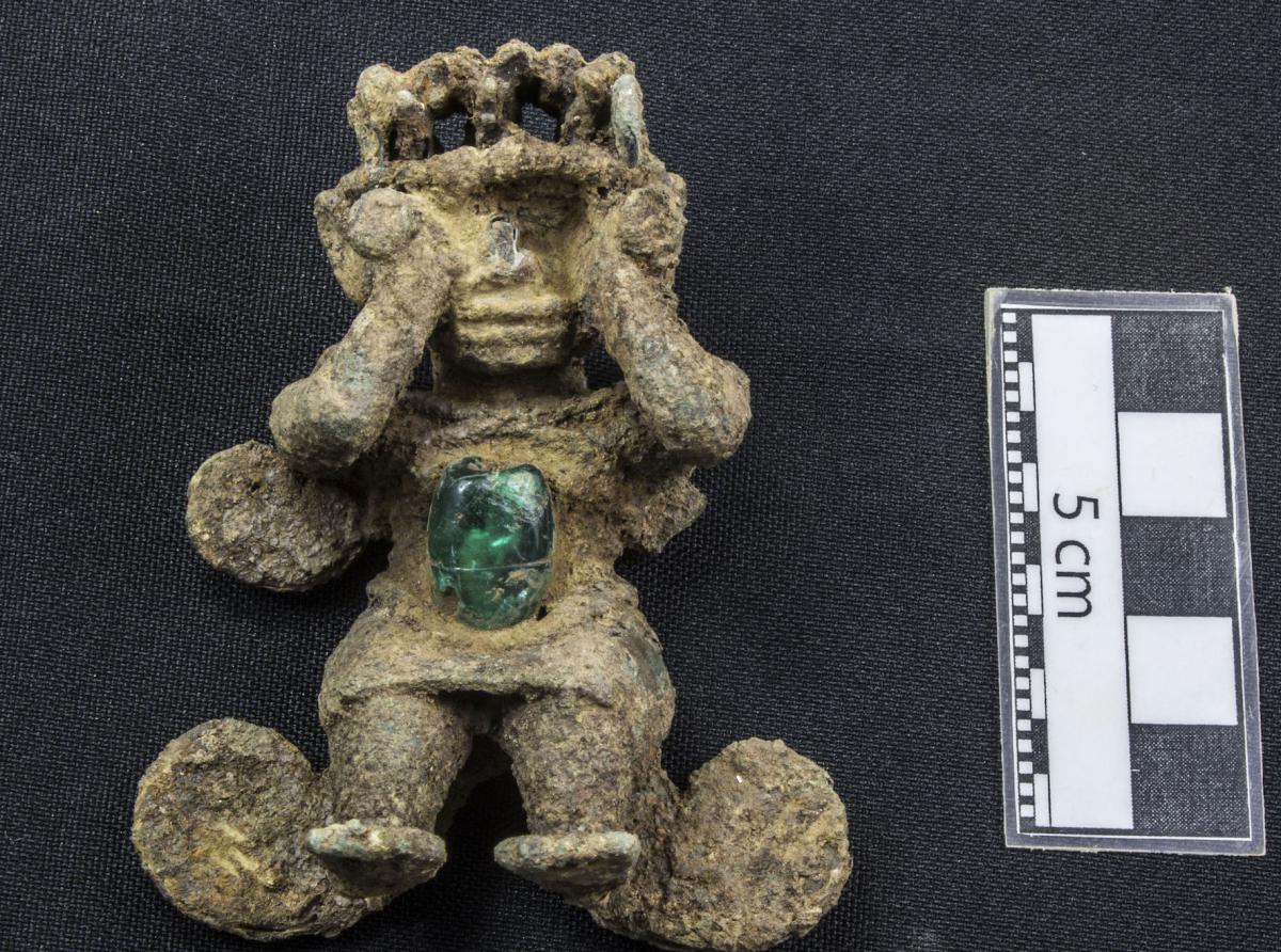 Información del recurso:  Detalle del pendiente figurativo de cobre fundido CU11149 mostrando la perforación de la esmeralda que la figura lleva embutida en su abdomen.