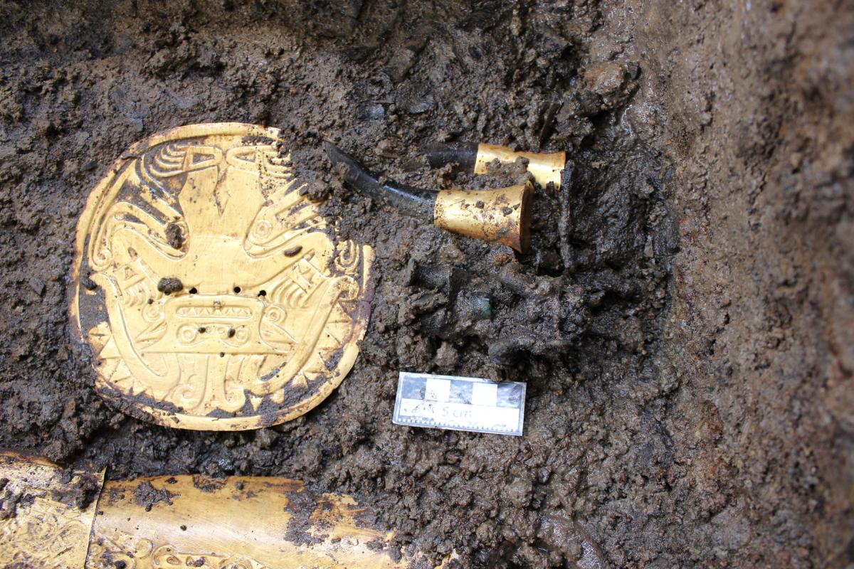 Información del recurso:  Contexto de aparición del pendiente figurativo de cobre fundido CU11149 formando parte del ajuar funerario del individuo principal de la Tumba T4. Es posible observarlo boca arriba, hundido en el terreno, a la izquierda del pectoral de oro.