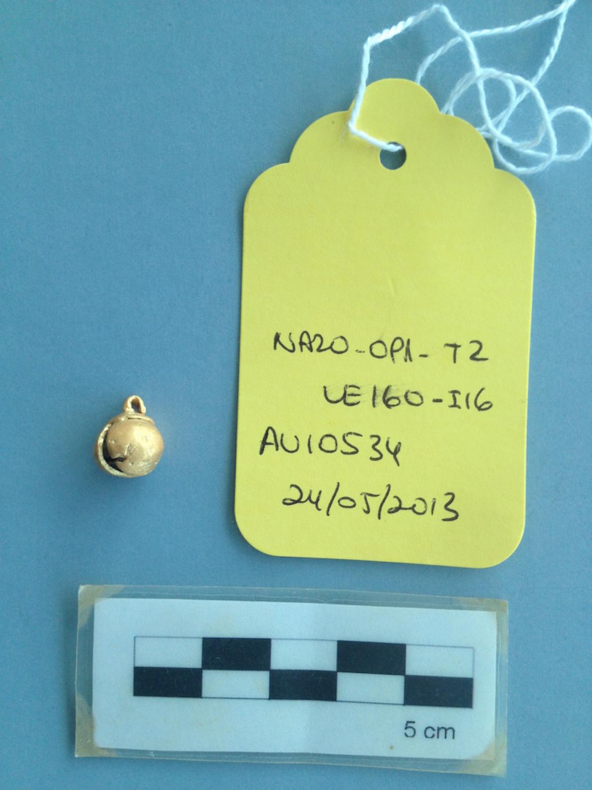 425 - Tapón de la orejera de piedra y fundas de oro registrada con el número 5083 y asociada al individuo I05 encontrado en la unidad UE088 (primer nivel de la tumba T2).