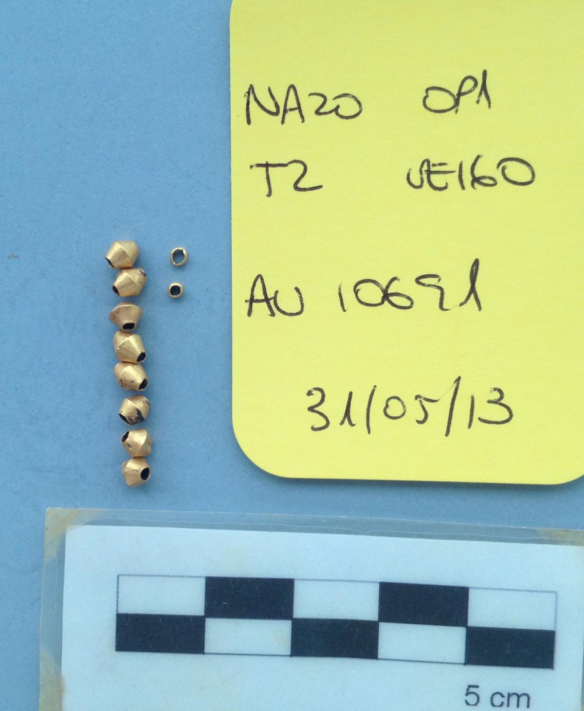425 - Tapón de la orejera de piedra y fundas de oro registrada con el número 5083 y asociada al individuo I05 encontrado en la unidad UE088 (primer nivel de la tumba T2).
