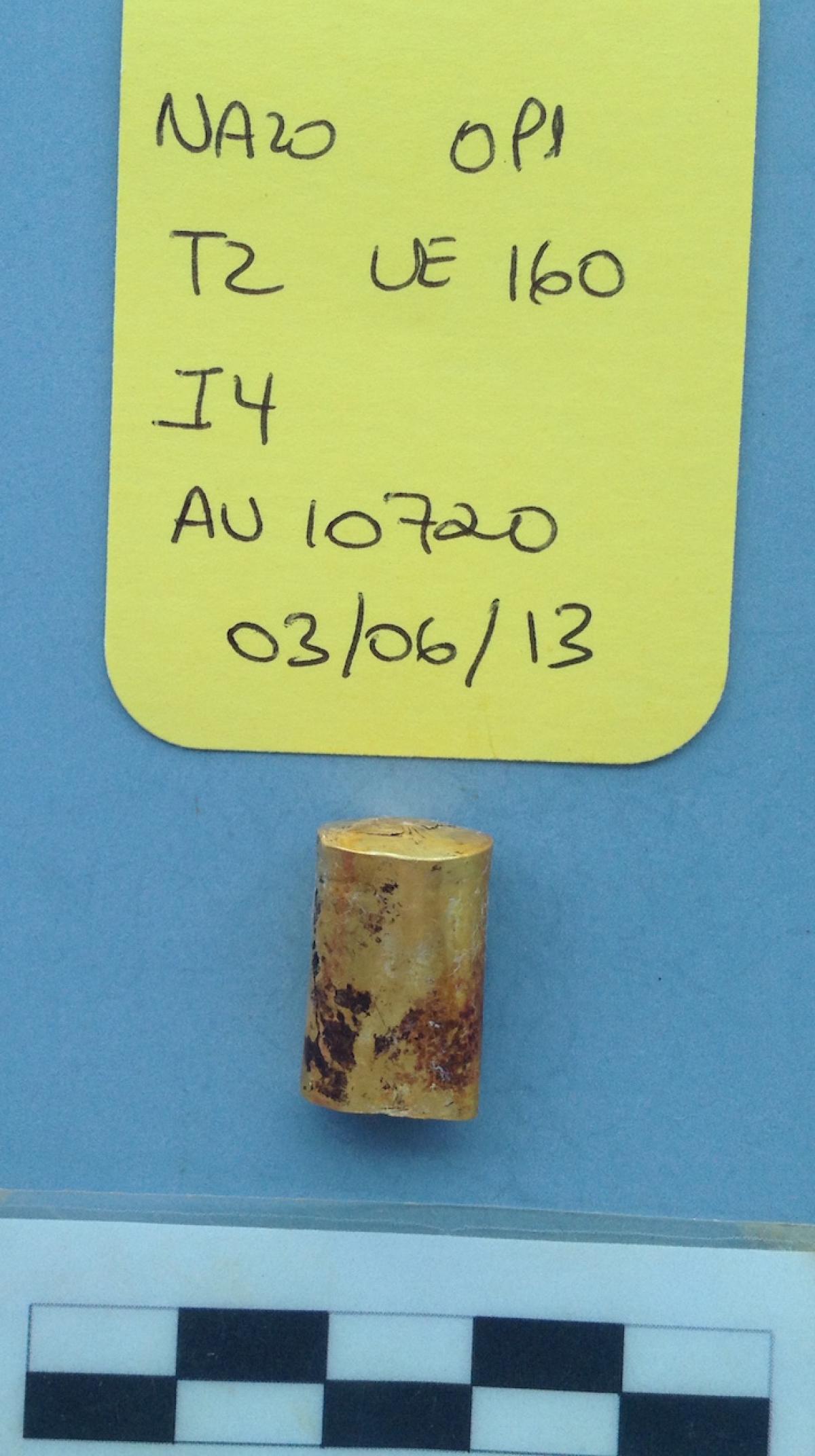 425 - Tapón de la orejera de piedra y fundas de oro registrada con el número 5083 y asociada al individuo I05 encontrado en la unidad UE088 (primer nivel de la tumba T2).