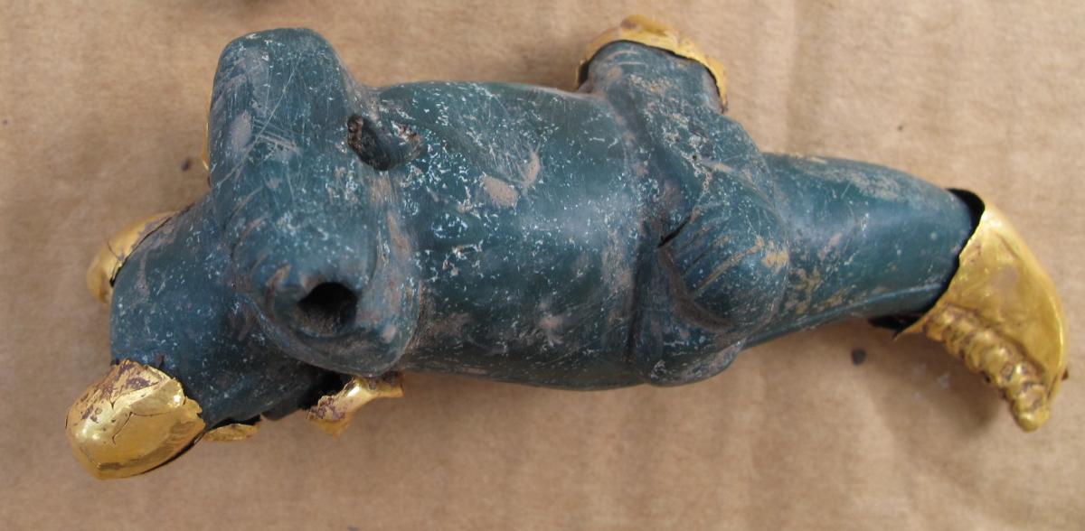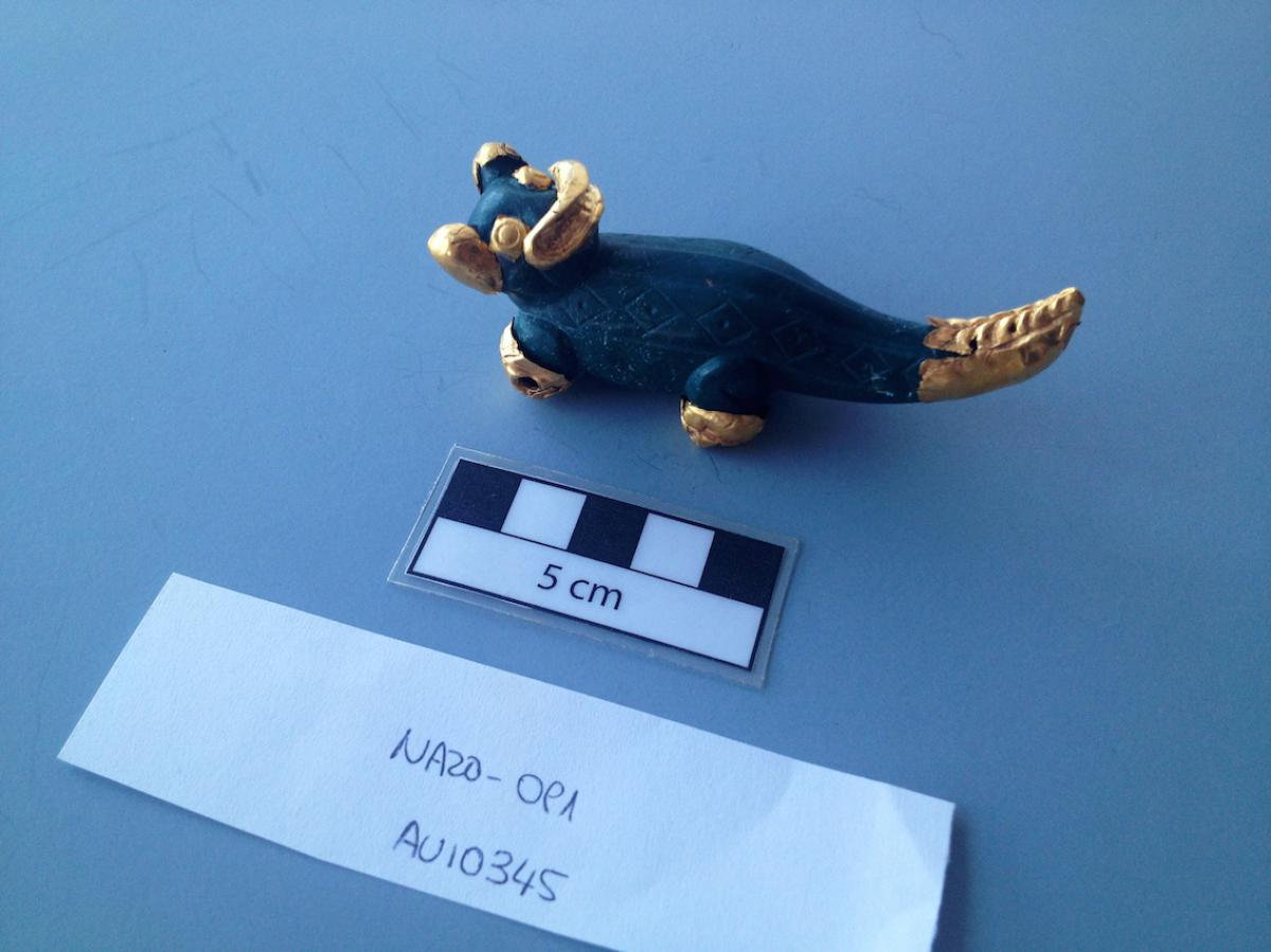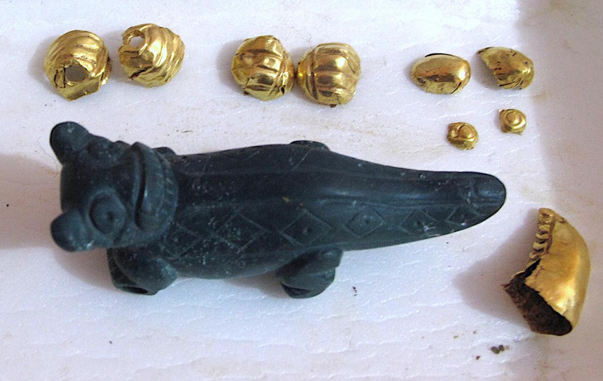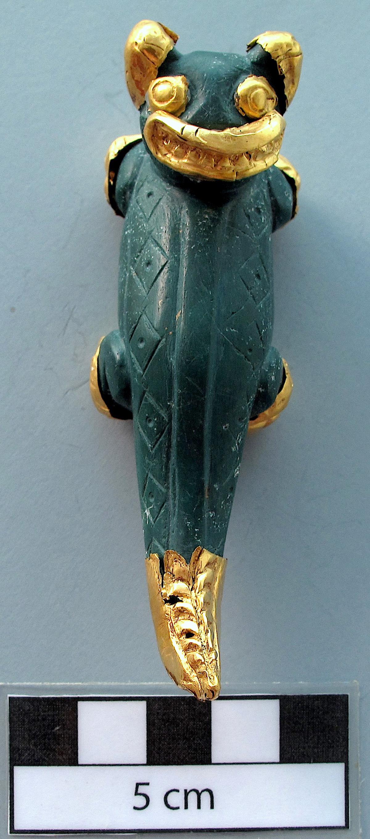 Información del recurso:  Vista separada del pendiente de piedra verde-azulada AU10345 y las láminas de oro repujadas que cubrían partes de su cuerpo. Puede observarse que lo repujado en las fundas no se corresponde exactamente con lo tallado en la piedra. Los casos mas claros son los ojos y la cola. 8,8 x 2,9 cm. Estilo Conte.