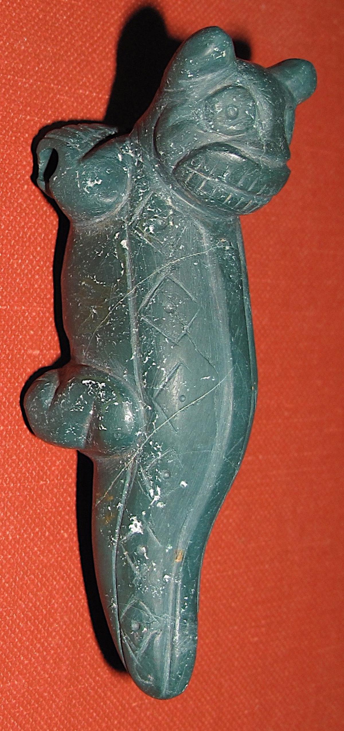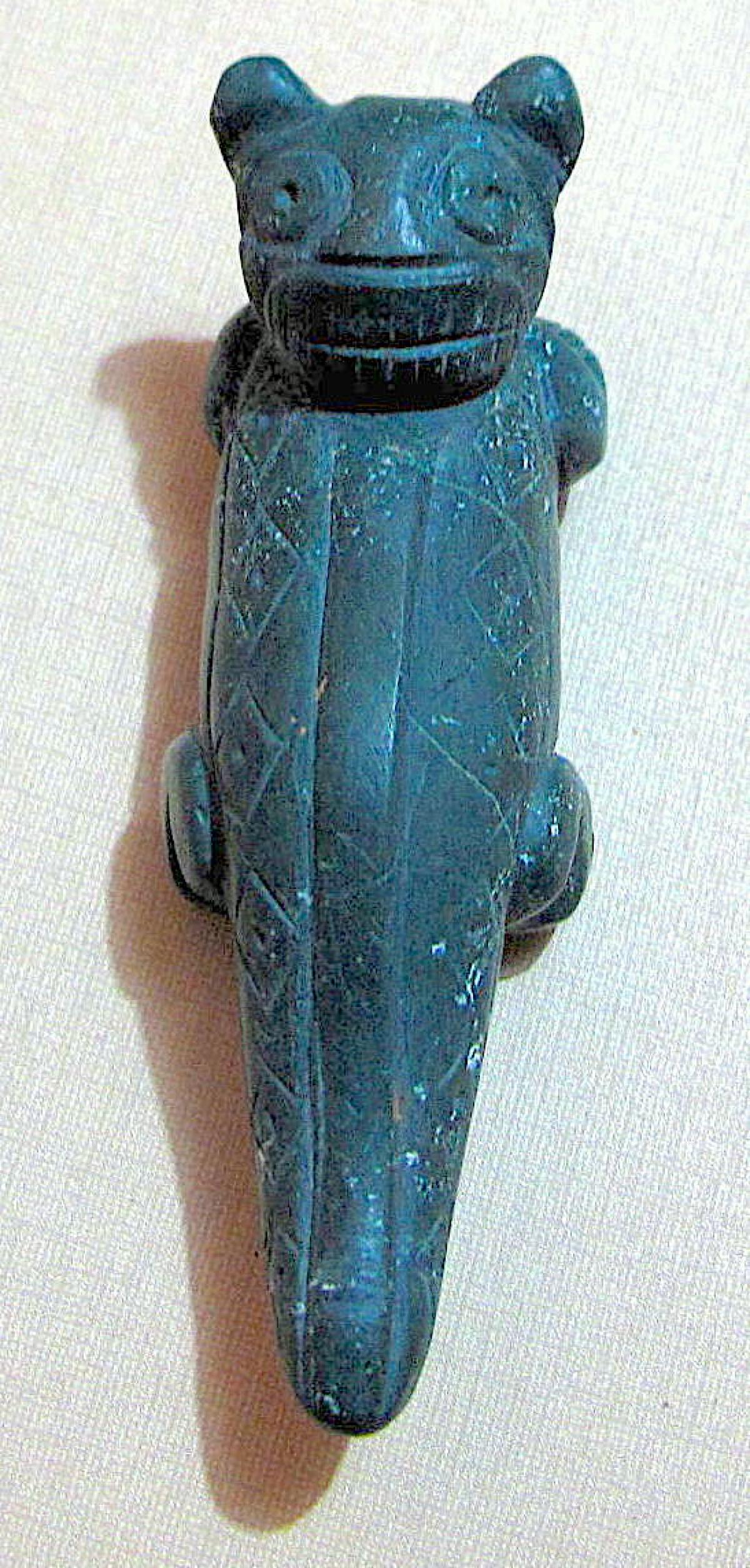 Información del recurso:  Vista frontal del pendiente de piedra verde-azulada AU10345 tallado en forma de un ser sobrenatural híbrido de jaguar y cocodrilo despojado de las láminas de oro repujadas que cubrían algunas partes de su cuerpo. 8,8 x 2,9 cm. Estilo Conte.