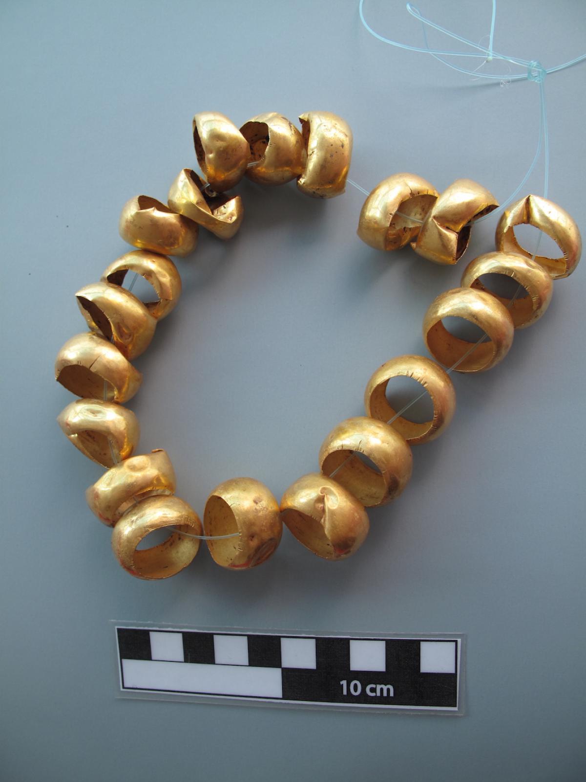 454 - Pulsera compuesta por 39 cascabeles de oro fundido que tienen un espesor alrededor de 2 mm oscilando sus tamaños entre 9 y 13 mm de diámetro y 11 a 16 mm de largo. El objeto formaba parte ...