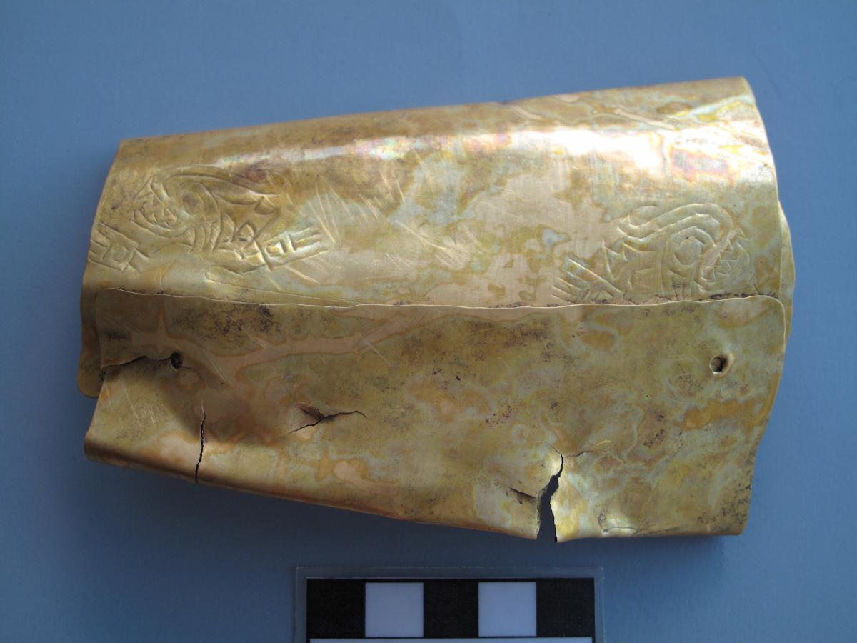 Información del recurso:  Brazalete elaborado a partir de una lámina martillada de oro. Lleva grabado dos cocodrilos antropomorfos de perfil ligados por un cinturón caminan erguidos en dirección contraria. Estilo Conte