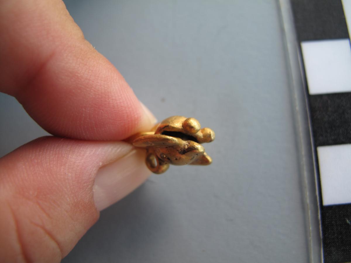 Información del recurso:  Detalle de la parte inferior del pendiente cascabel AU10443 con la ranura típica de estos artefactos.