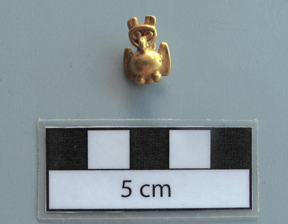 Información del recurso:  Pendiente cascabel de oro fundido en forma de búho con las alas plegadas. El oro de suspensión se localiza en su parte trasera.