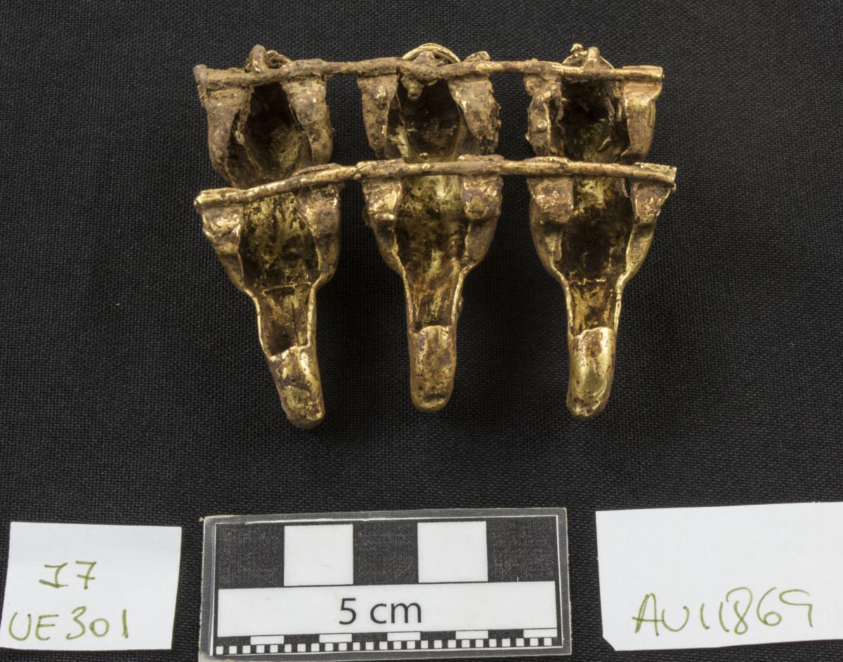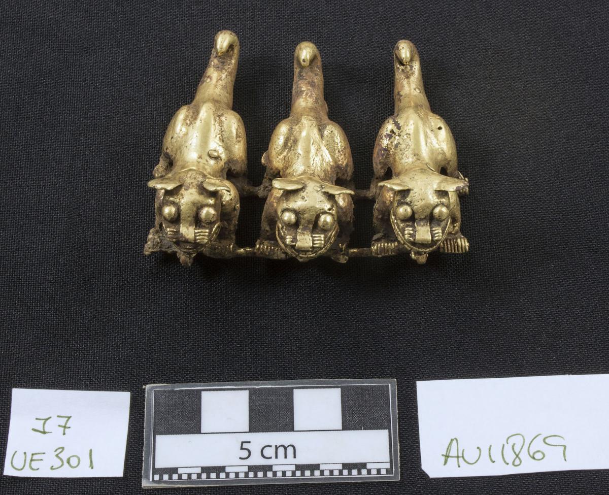 377 - Pendiente figurativo de oro fundido con la representación de un murciélago bicéfalo en vuelo que formaba parte del ajuar del individuo I5 de la tumba T2. EL aro de suspensión se localiza...