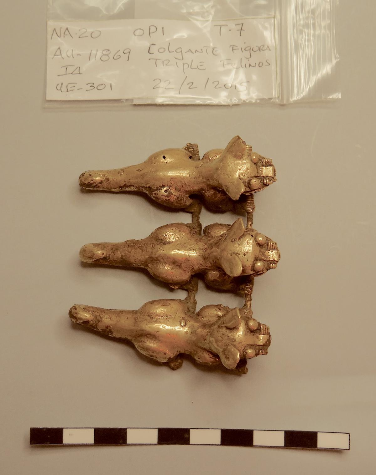 398 - Pendiente figurativo de oro fundido que formaba parte del ajuar del individuo I9 de la tumba T2. Es una figura masculina bicéfala desnuda en pie que sostiene con ambas manos una trompeta ce...
