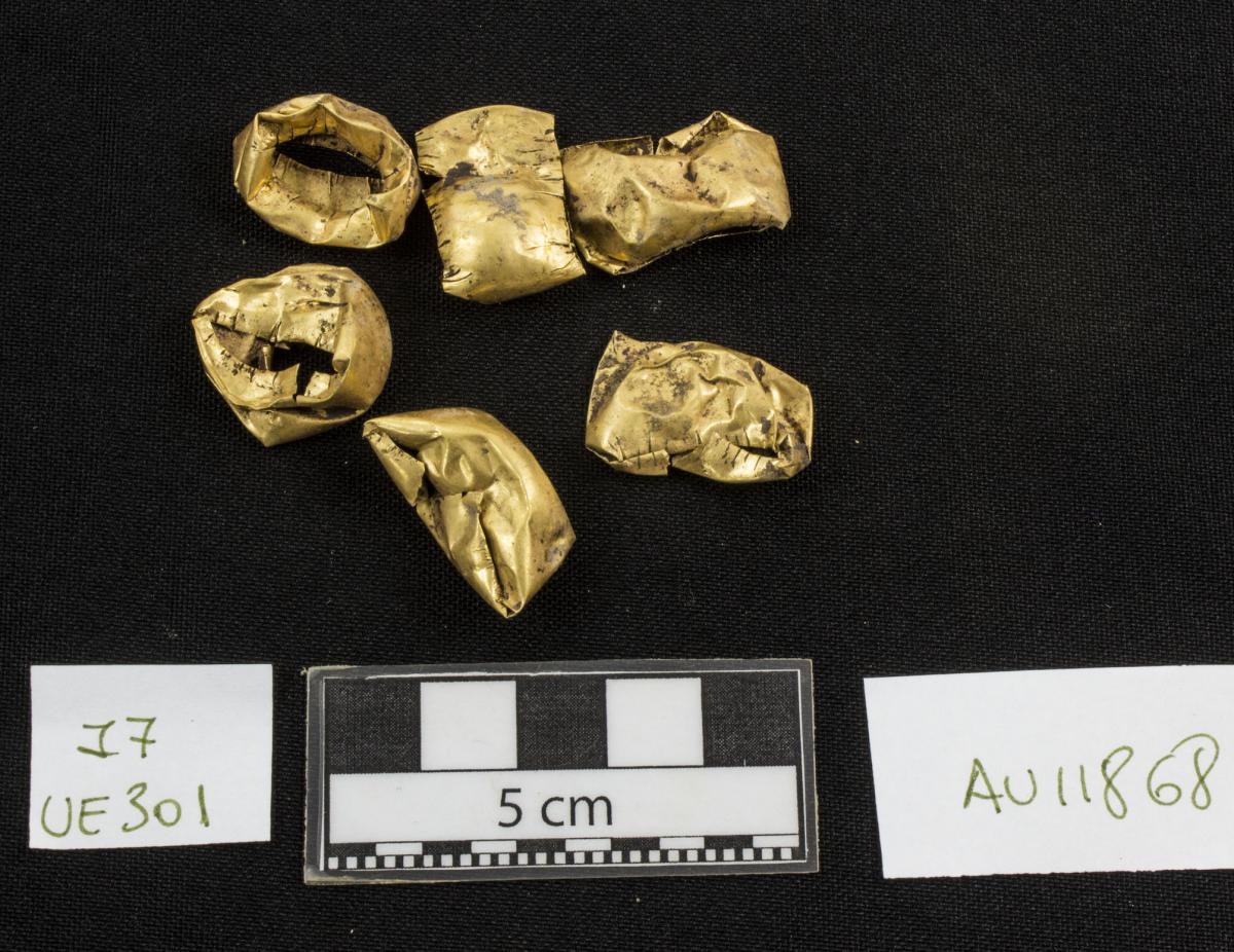 452 - Brazalete troncocónico elaborado con una lámina de oro perteneciente al ajuar del individuo I1 de la tumba T1. Lleva cuatro orificios para introducir los elementos de atado.