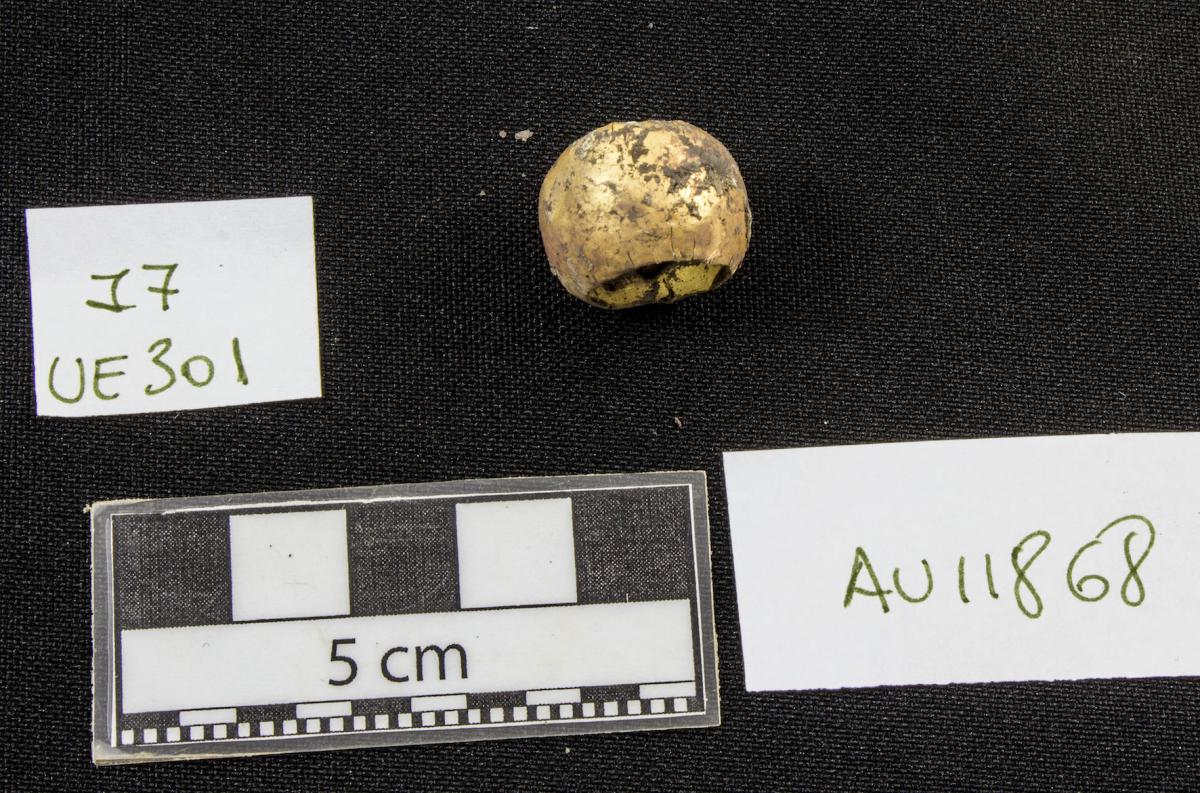 425 - Tapón de la orejera de piedra y fundas de oro registrada con el número 5083 y asociada al individuo I05 encontrado en la unidad UE088 (primer nivel de la tumba T2).