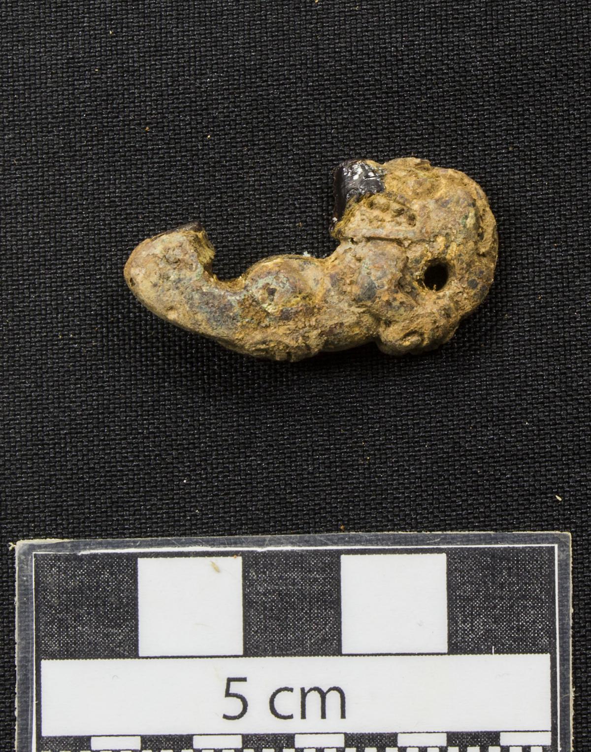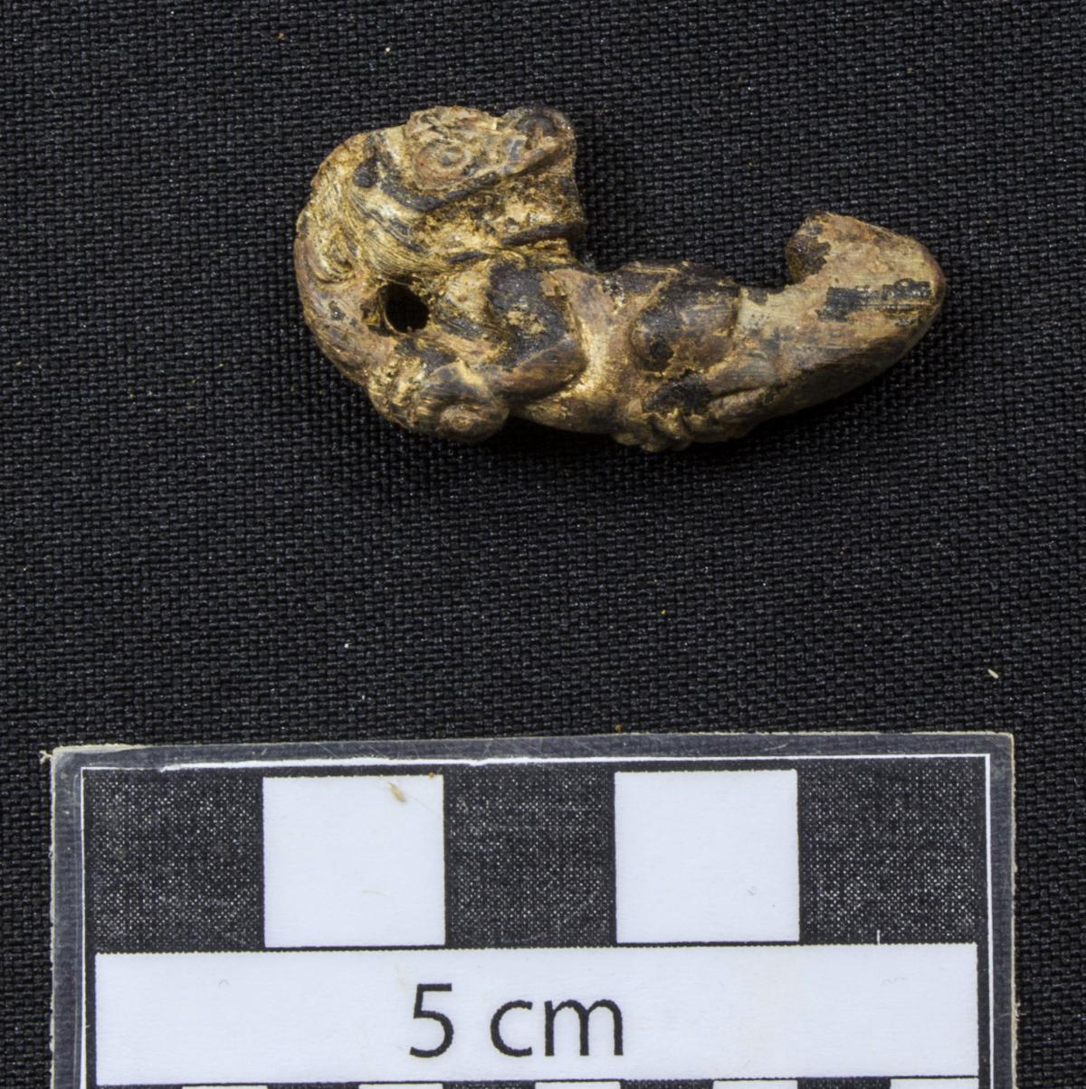 374 - Pendiente zoomorfo representando a un pelícano con la cabeza girada y apoyada sobre el lomo. Presenta la boca dentada y dos orificios para ser colgada. Formaba parte de un collar de canino...