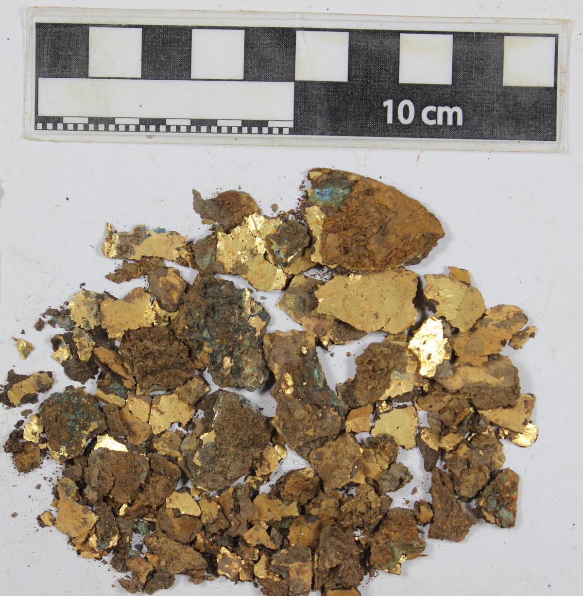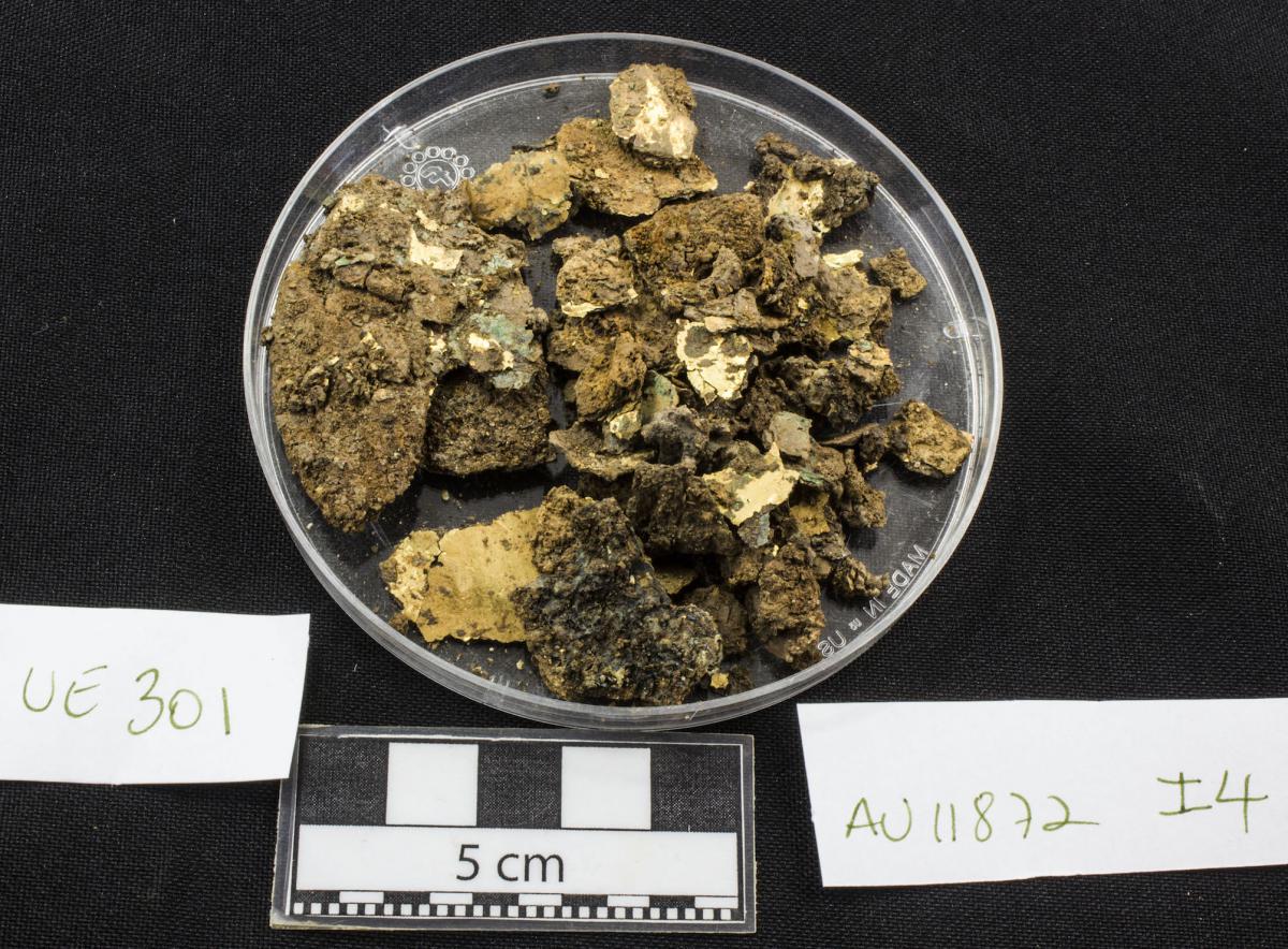 425 - Tapón de la orejera de piedra y fundas de oro registrada con el número 5083 y asociada al individuo I05 encontrado en la unidad UE088 (primer nivel de la tumba T2).