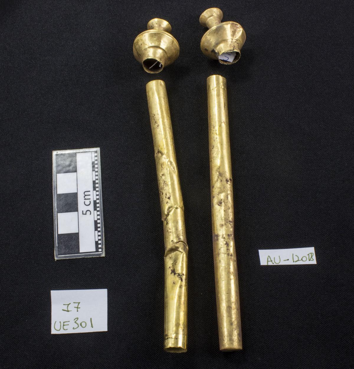 409 - Par de orejeras tubulares de piedra verde (glauconita) con fundas laminares de oro en los extremos, formaban parte del ajuar del individuo I7 de la tumba T2.