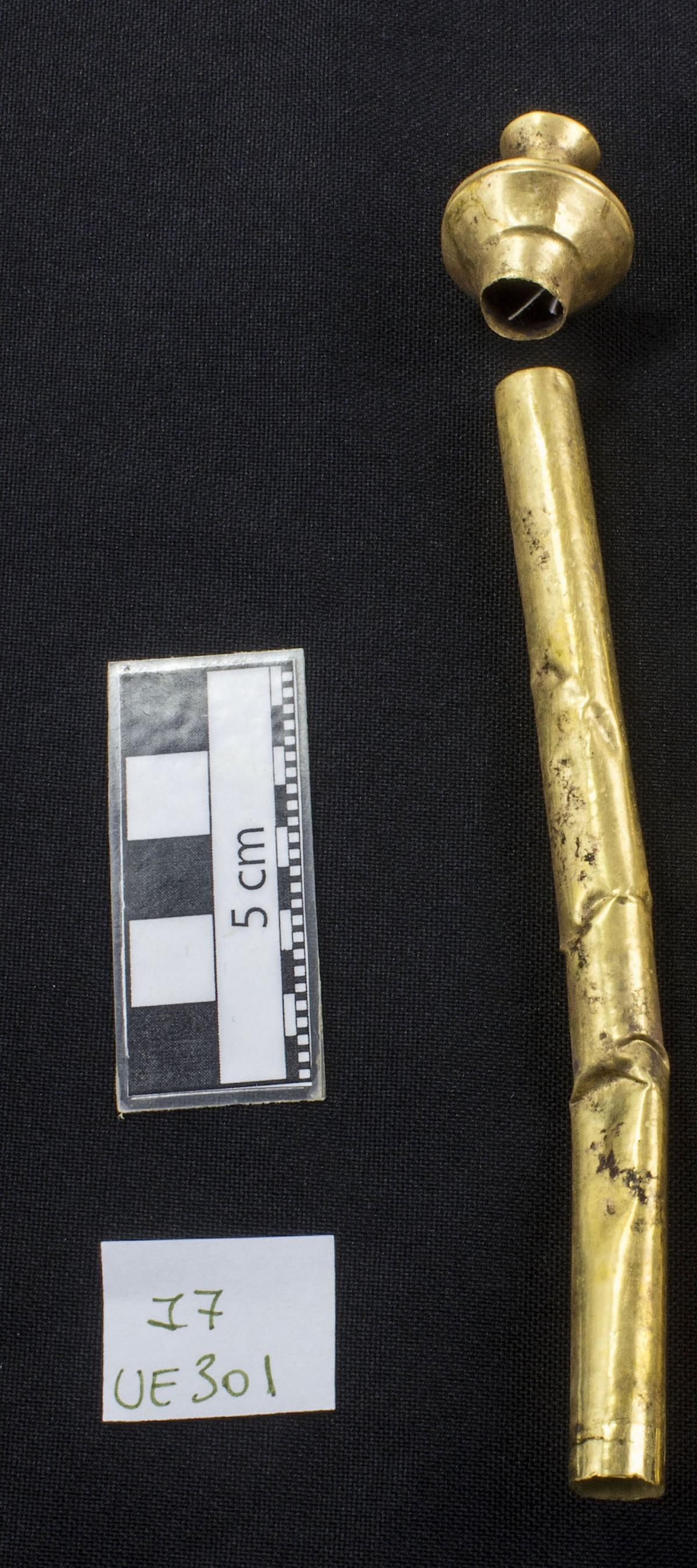 425 - Tapón de la orejera de piedra y fundas de oro registrada con el número 5083 y asociada al individuo I05 encontrado en la unidad UE088 (primer nivel de la tumba T2).
