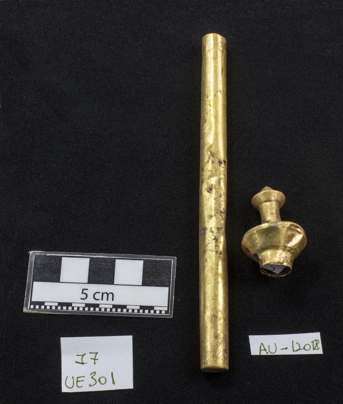 425 - Tapón de la orejera de piedra y fundas de oro registrada con el número 5083 y asociada al individuo I05 encontrado en la unidad UE088 (primer nivel de la tumba T2).