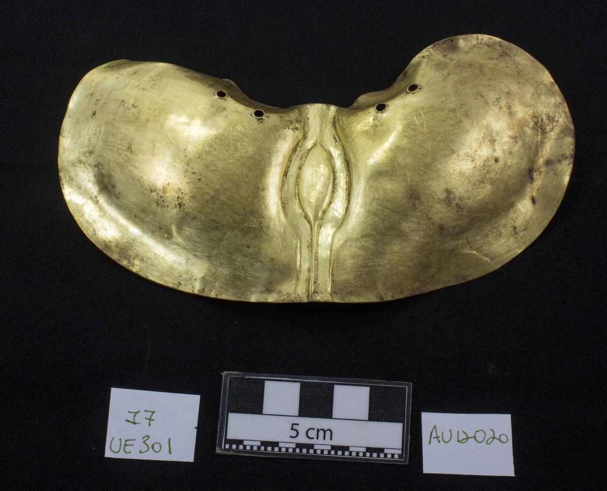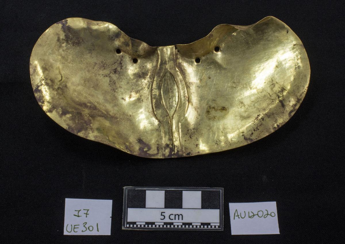 387 - Pectoral de oro martillado repujado con la representación frontal del rostro de un ser sobrenatural con rasgos de un anciano que formaba parte del ajuar del Individuo 20, un infante, de la ...