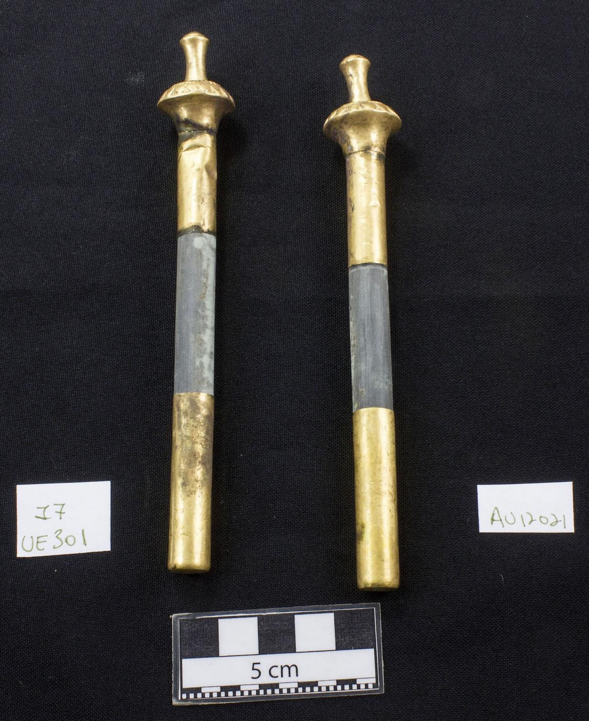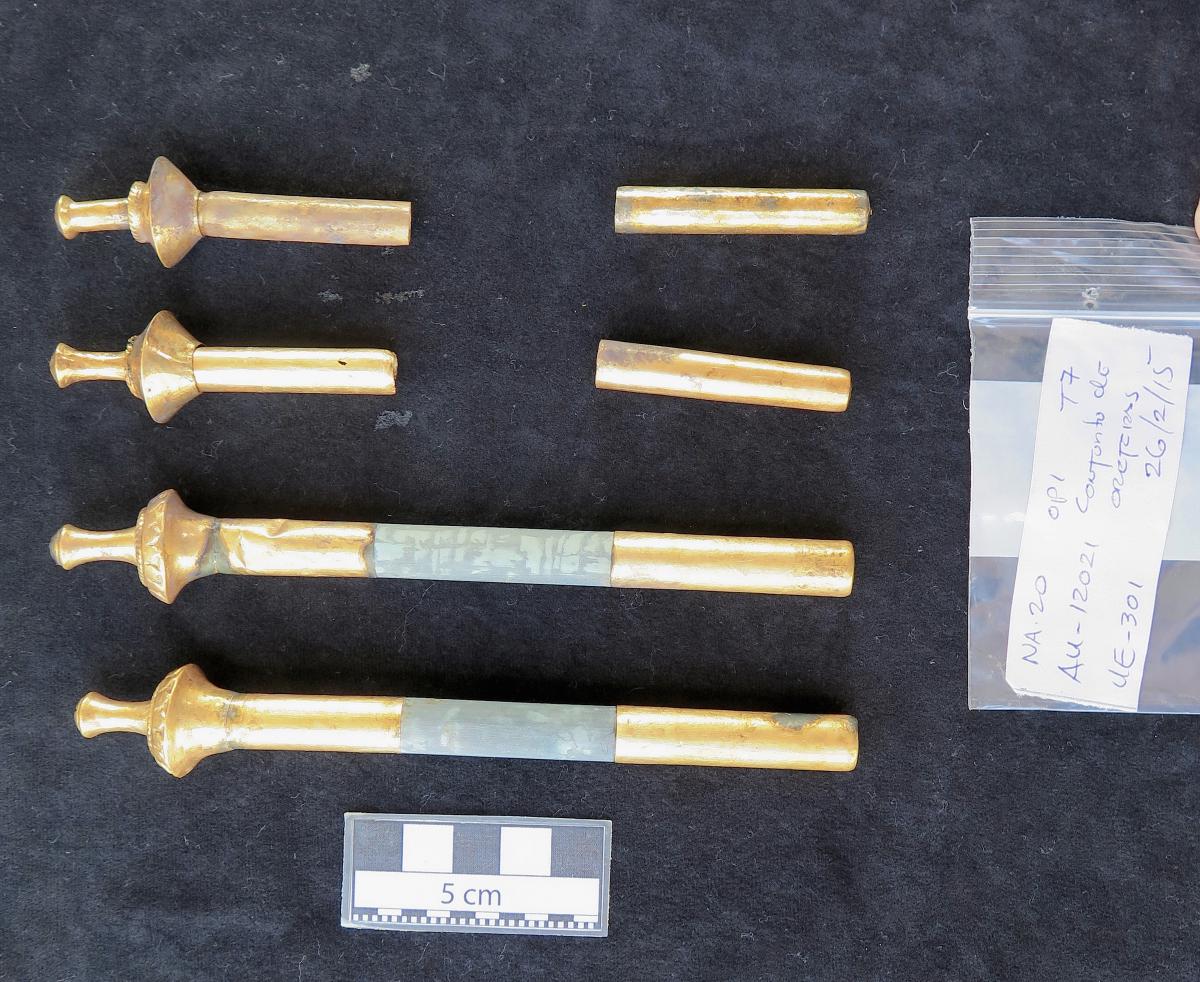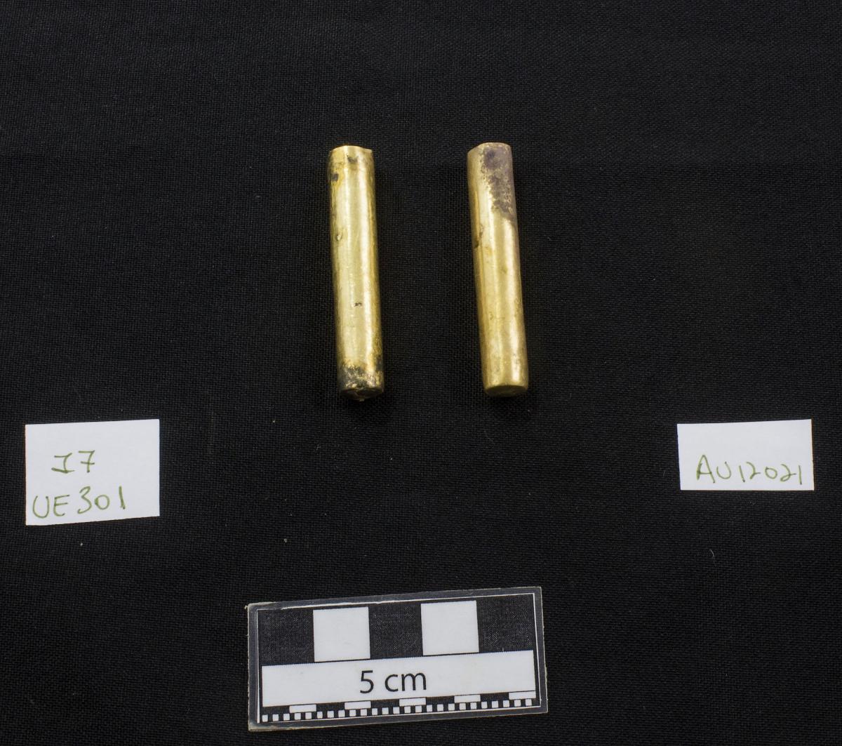 409 - Par de orejeras tubulares de piedra verde (glauconita) con fundas laminares de oro en los extremos, formaban parte del ajuar del individuo I7 de la tumba T2.