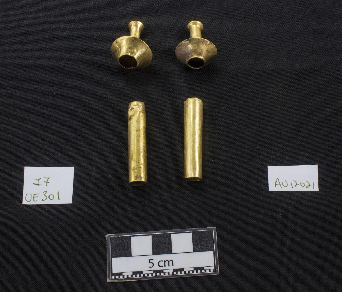 425 - Tapón de la orejera de piedra y fundas de oro registrada con el número 5083 y asociada al individuo I05 encontrado en la unidad UE088 (primer nivel de la tumba T2).