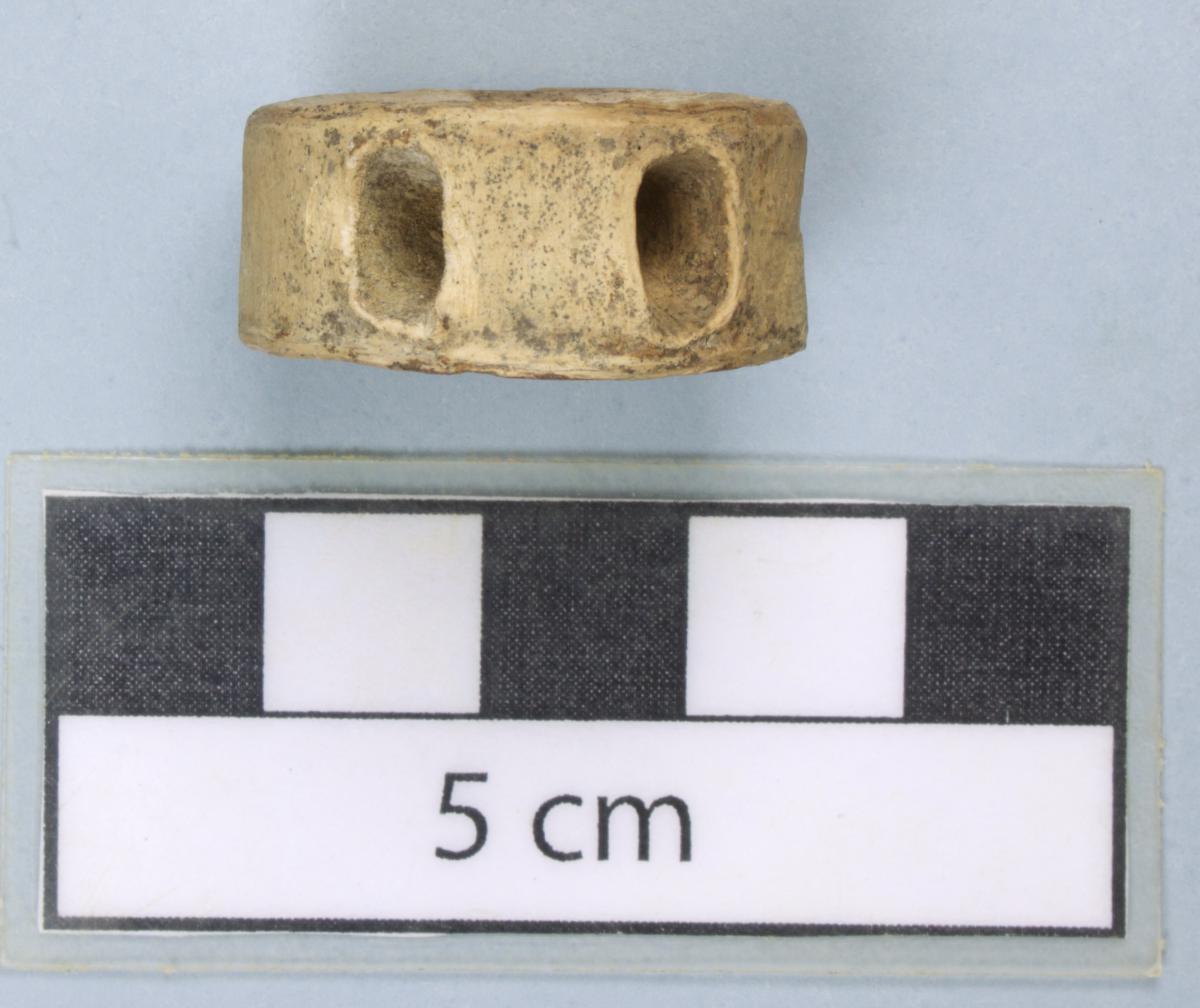 3553 - Cuenta de forma trapezoidal. Presenta dos perforaciones.