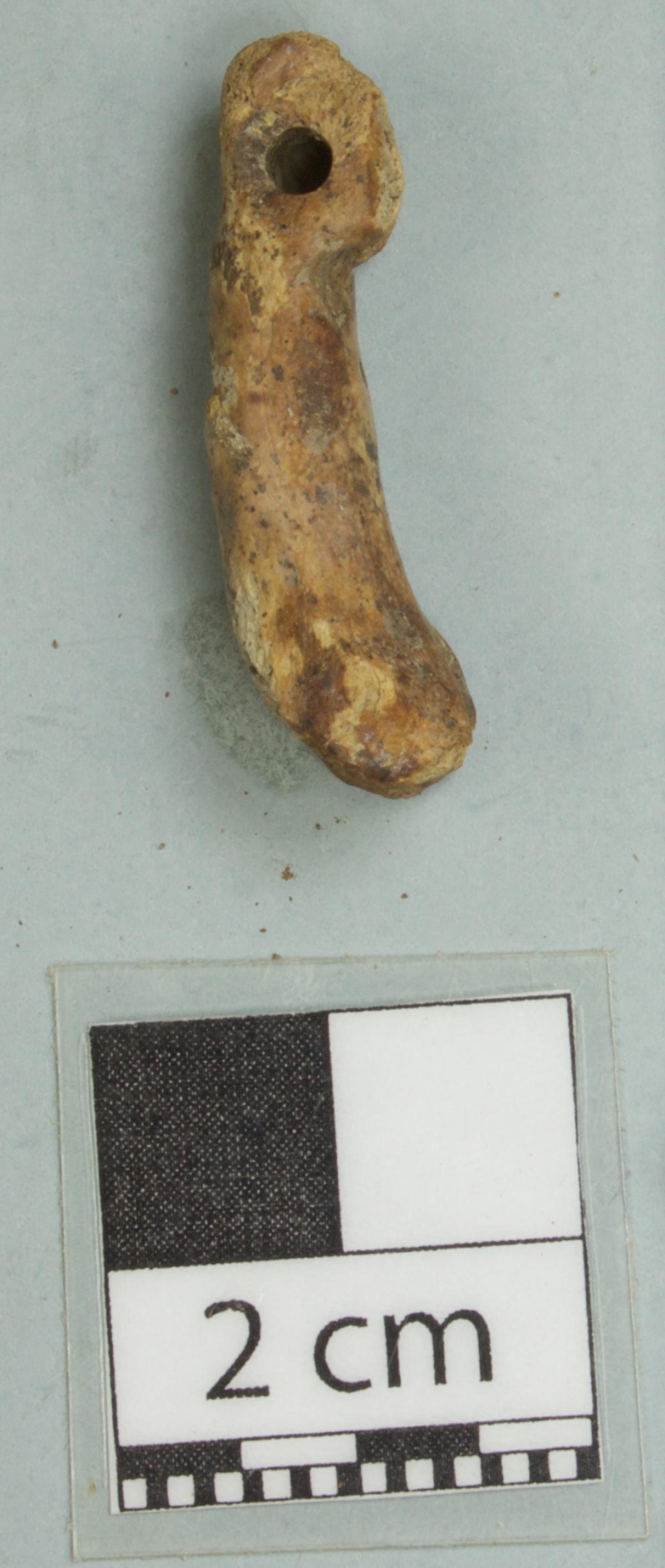 374 - Pendiente zoomorfo representando a un pelícano con la cabeza girada y apoyada sobre el lomo. Presenta la boca dentada y dos orificios para ser colgada. Formaba parte de un collar de canino...