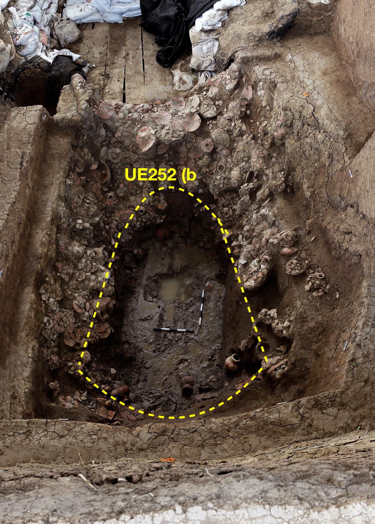 381 - T6-UE125 (a , (llamado en el año 2013, unidad UE167).Entierro de la tumba T6. Depósito de huesos humanos en posición primaria localizado a 3,48 m de profundidad. Es un entierro múltiple...