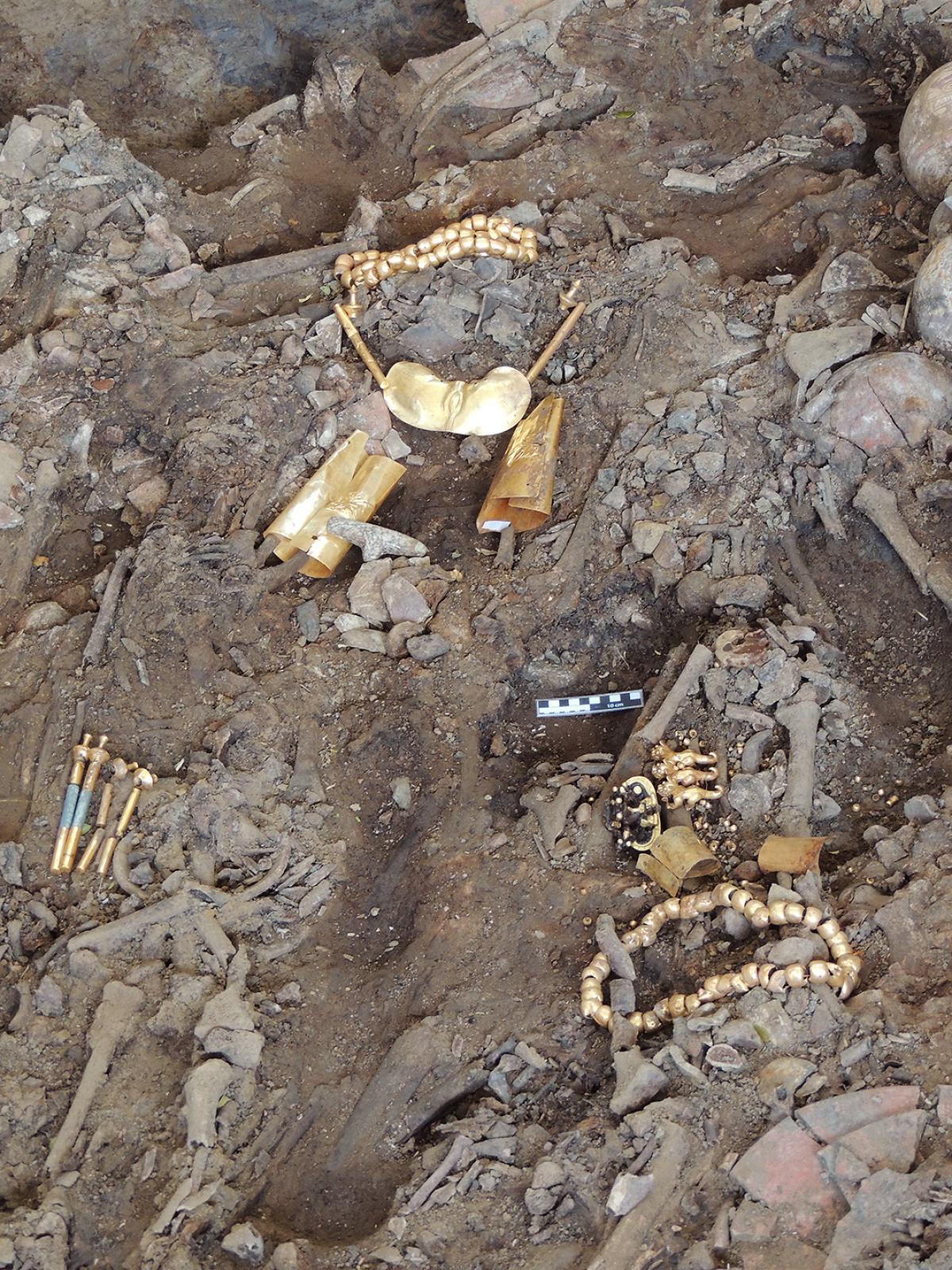 375 - T2-UE088. Depósito de artefactos y osamentas localizado a una profundidad de 2,20 m sobre la Plataforma II (piso más alto) de la tumba T2. Todos los cuerpos fueron colocados en decúbito v...
