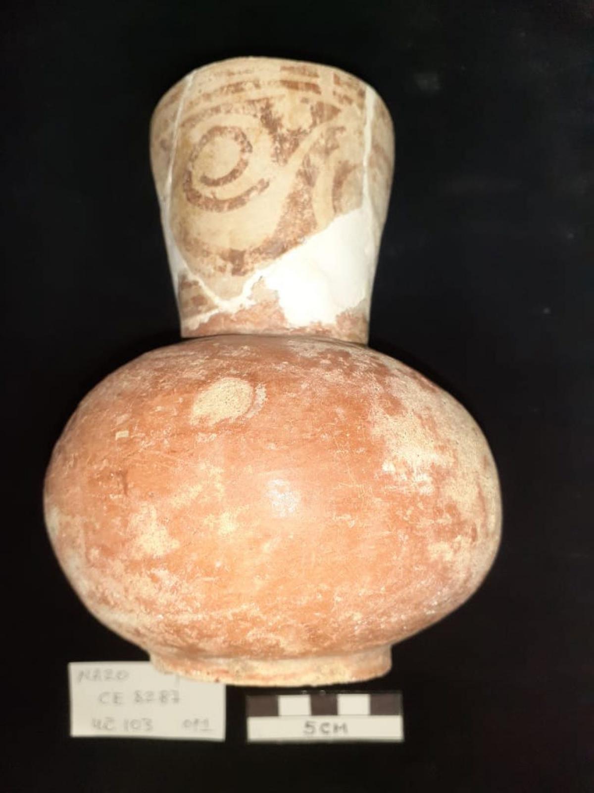 3565 - Jarra globular con base anular, cuello largo y borde recto. Engobe de color rojo en el exterior y engobe de color blanco sobre el cuello. Banda de color morado sobre el cuello.