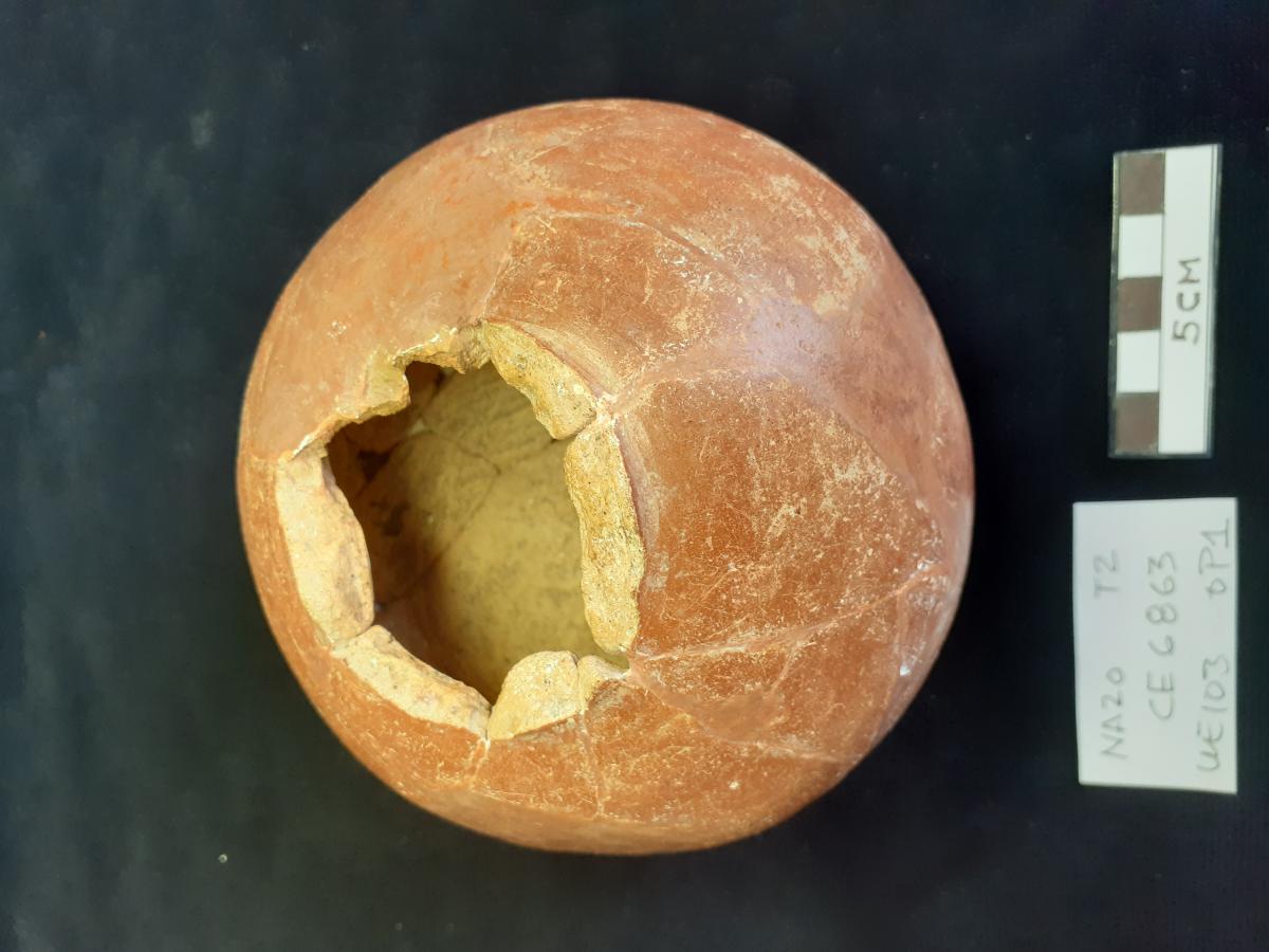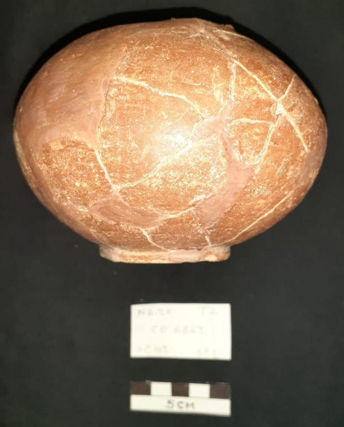 3632 - “Jarra globular de pasta roja plena, con base anular, borde recto y cuello corto