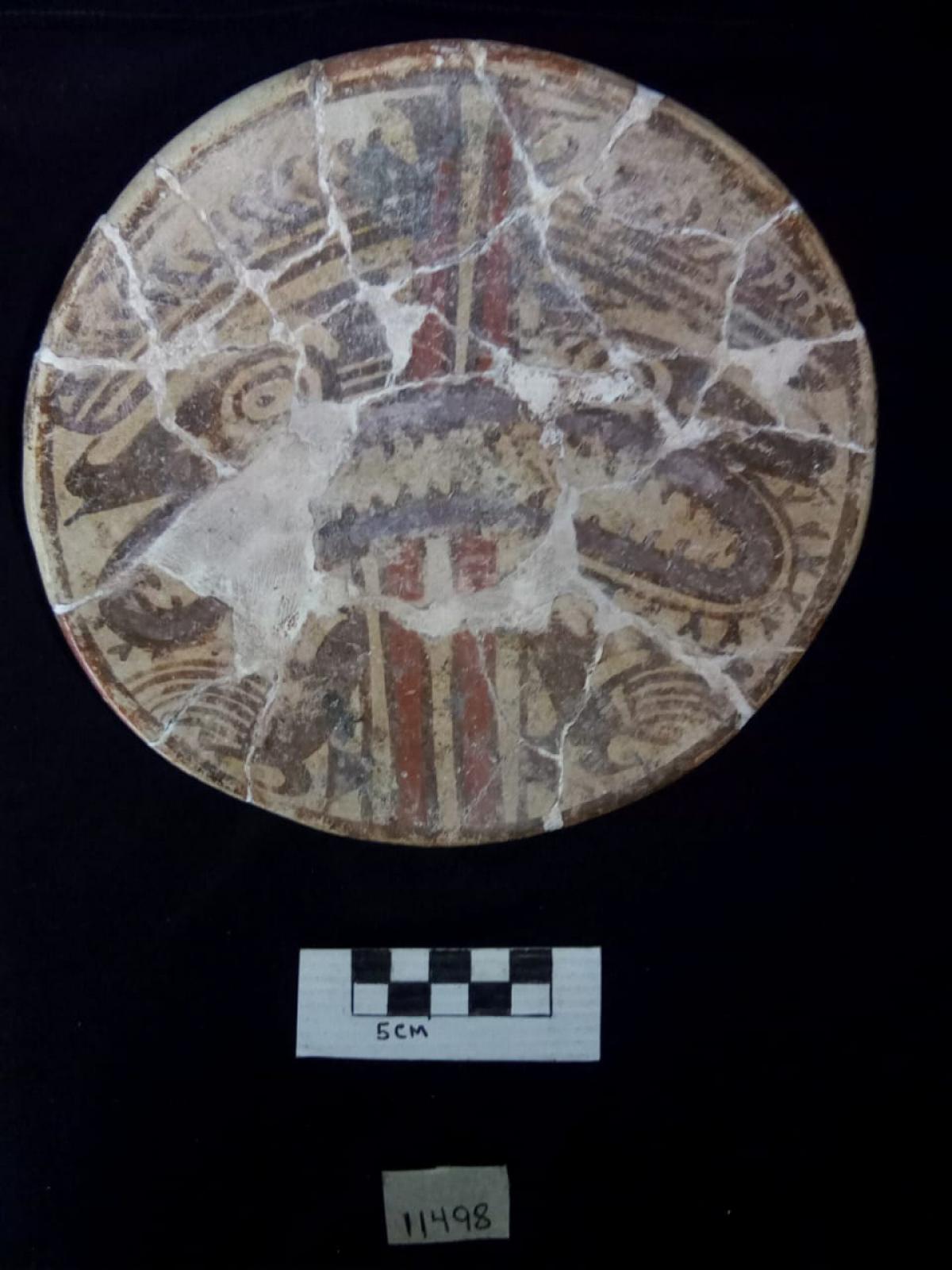 385 - Plato polícromo de borde engrosado exterior. Doble engobe (blanco en el anverso y rojo en el reverso) y decoración en bandas de color alternas zigzagueantes (rojo y morado).