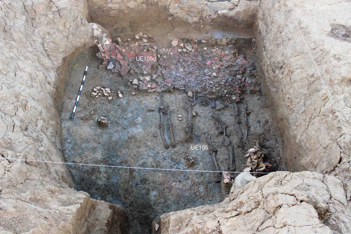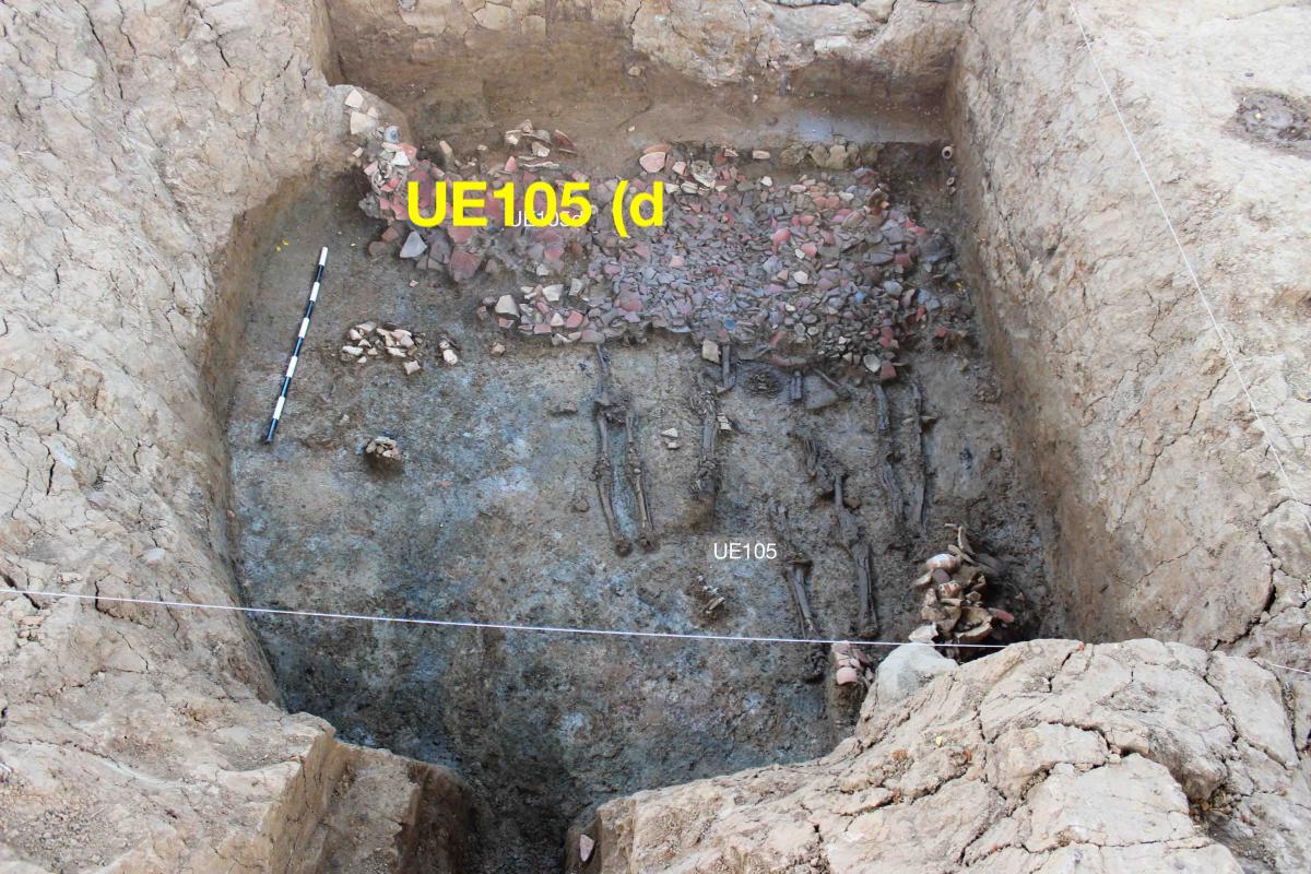 Vista de la unidad UE105d sobre el entierro UE105. Unidad integrada en su mayor parte por vasijas de cerámica -platos, cuencos, vasijas globulares, jarras e incensarios-, envueltas en una matriz muy escasa de tierra arcillosa gris oscuro, más oscura cuanto más profundizamos en su excavación