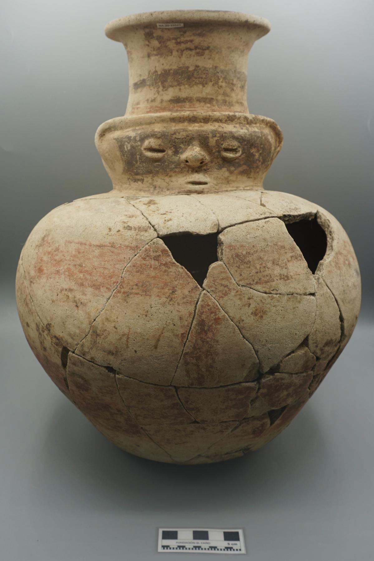efigie antropomorfa. Cuerpo de tendencia globular sin base anular y sin asa de apoyo. La decoración en brazos y cara representan con pinturas corporales o tatuajes