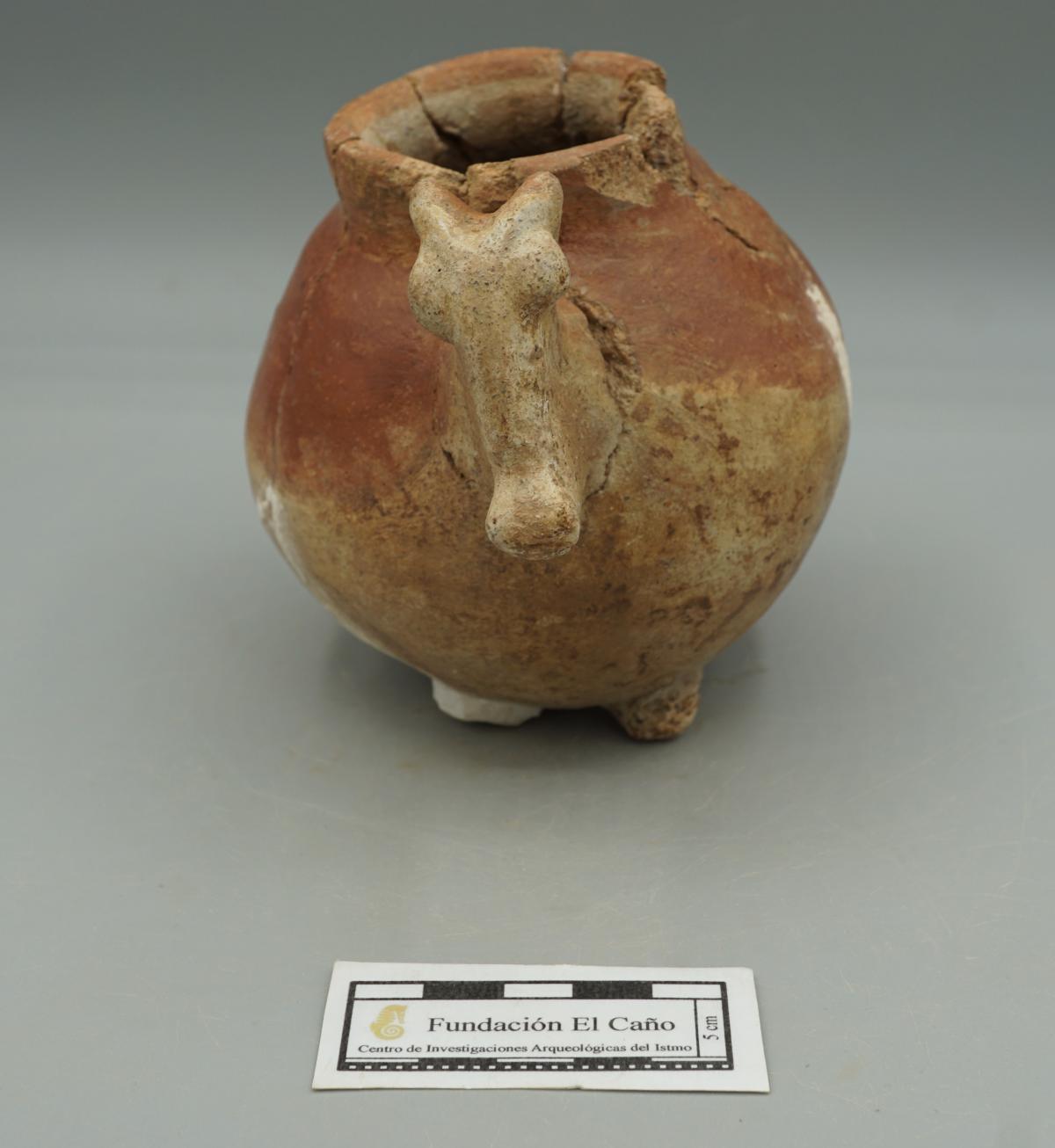 Jarra zoomorfa. Representa a un venado de cola blanca. Presenta engobe de color blanco en la zona inferior y rojo en la superior.