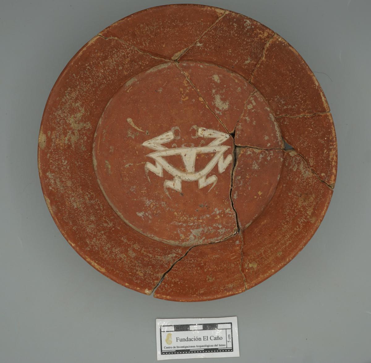 Cuenco circular de base anular, cuerpo y borde convexos. Engobe rojo en el interior y exterior. Decoración zoomorfa (crustáceo) sobre la base interna de la pieza.