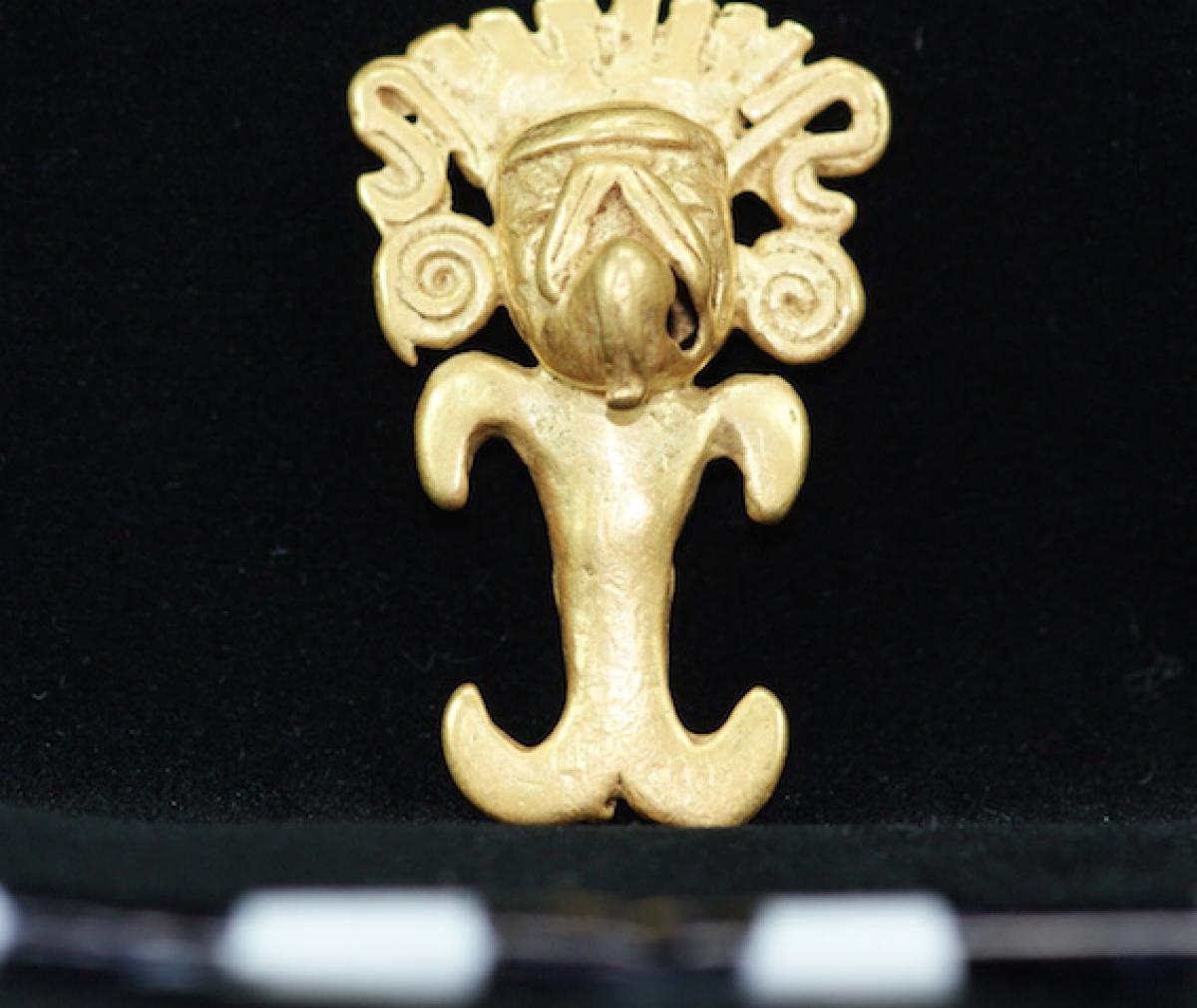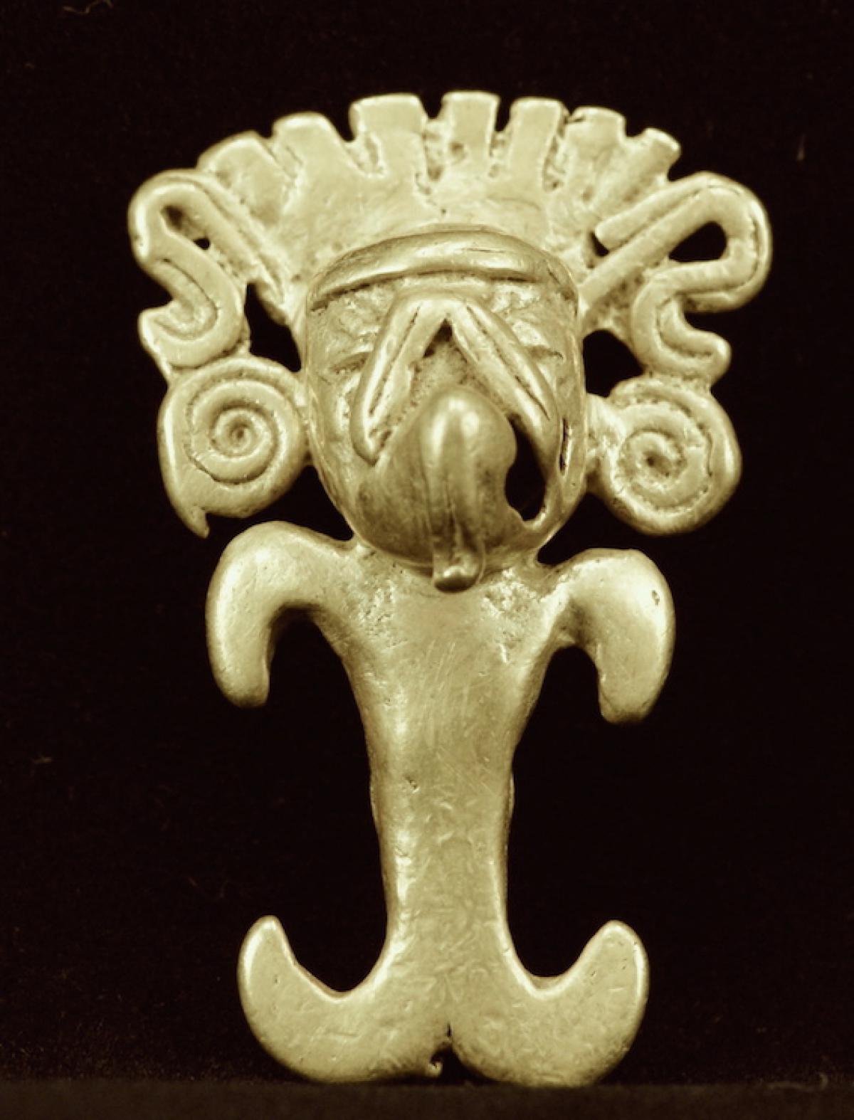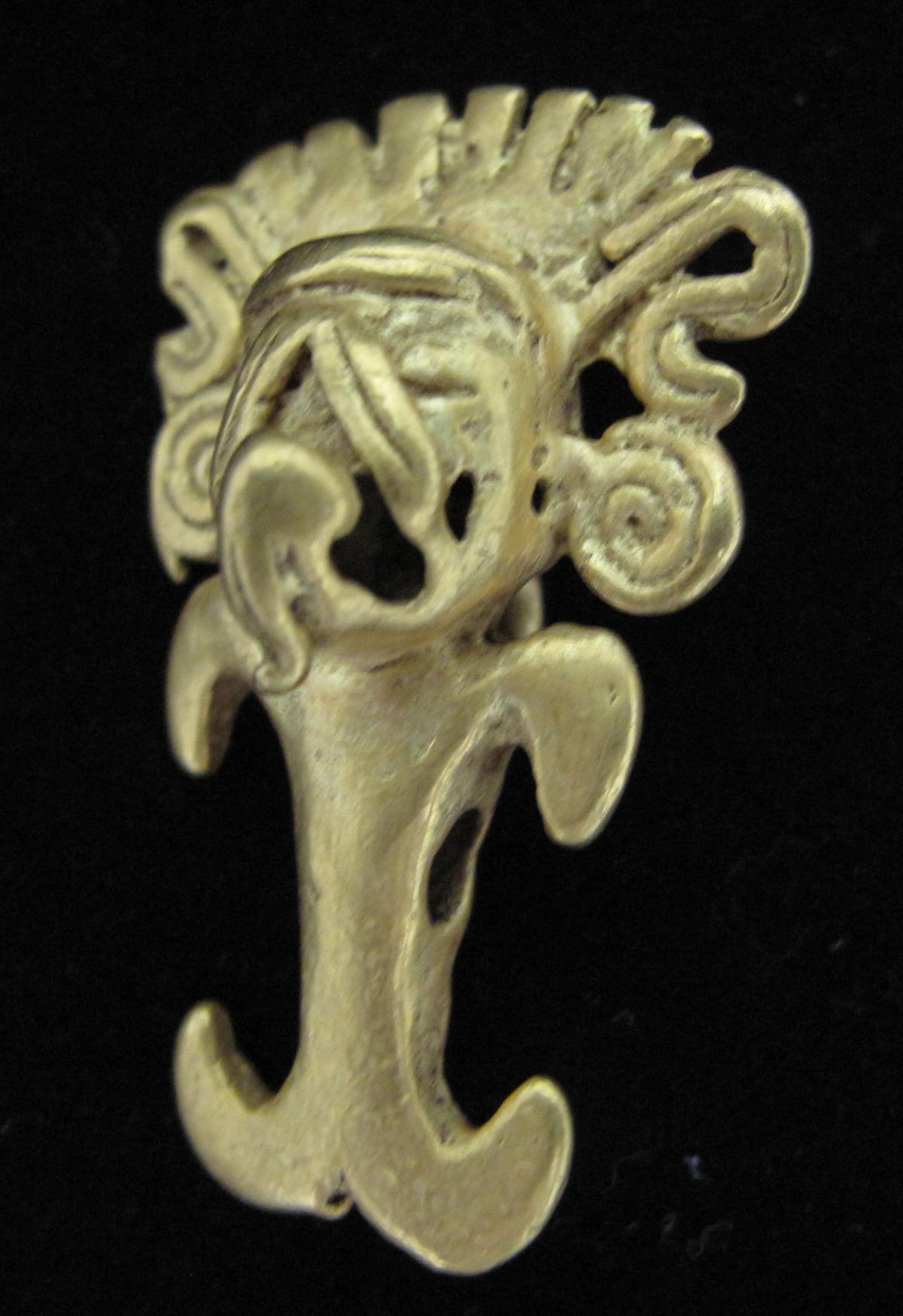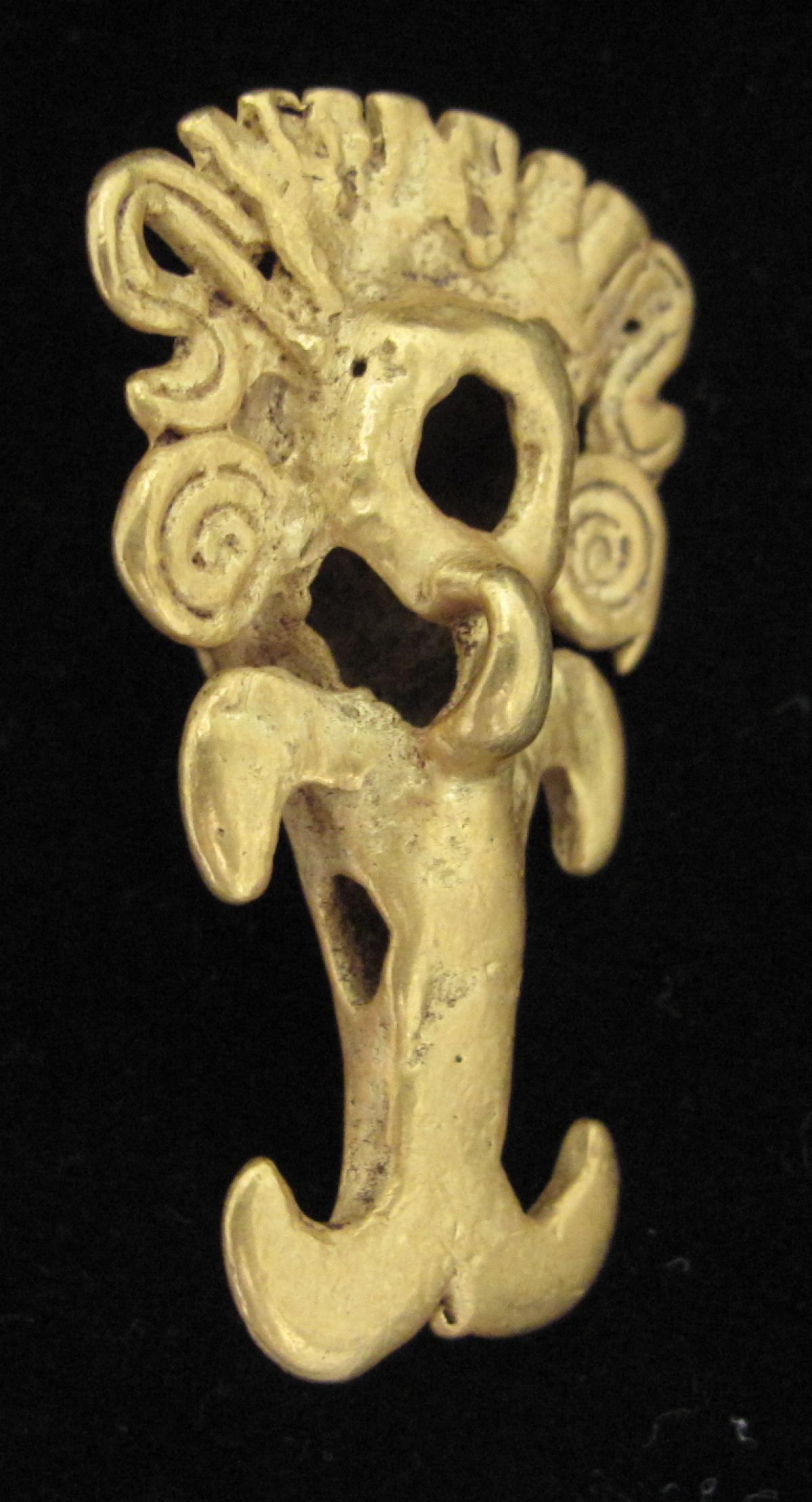 Información del recurso:  Vista frontal del pendiente figurativo de oro fundido 9897, parte del ajuar del individuo principal de la Tumba T6. 4,1 x 2,6 cm. Estilo Internacional.