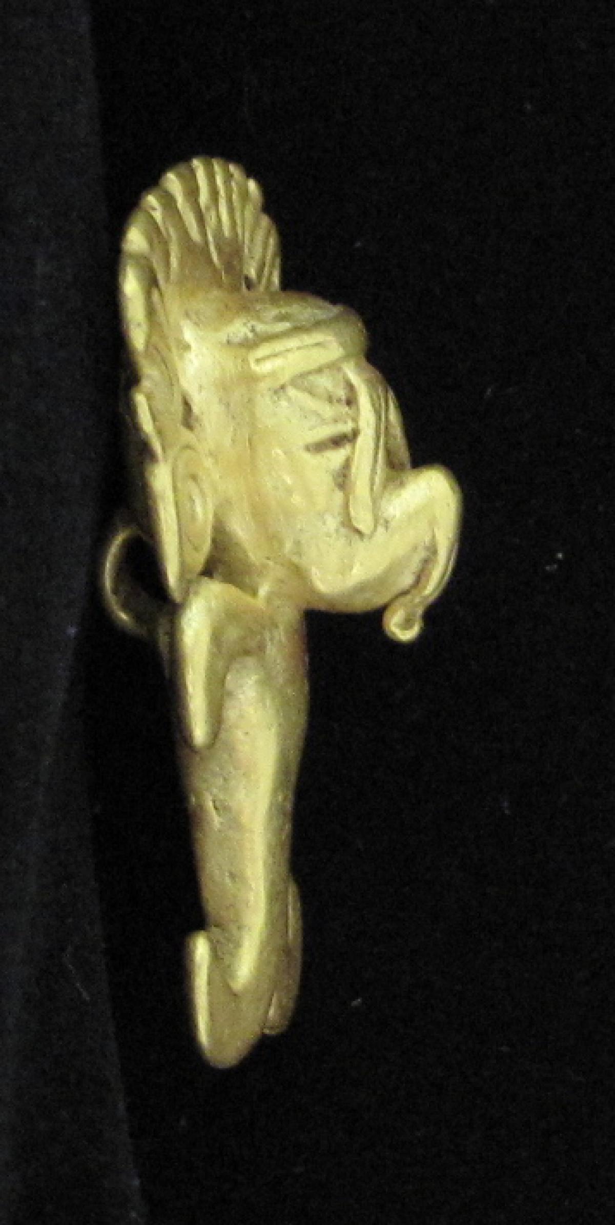 Información del recurso:  Vista lateral derecha del pendiente figurativo de oro fundido 9897, parte del ajuar del individuo principal de la Tumba T6. 4,1 x 2,6 cm. Estilo Internacional.