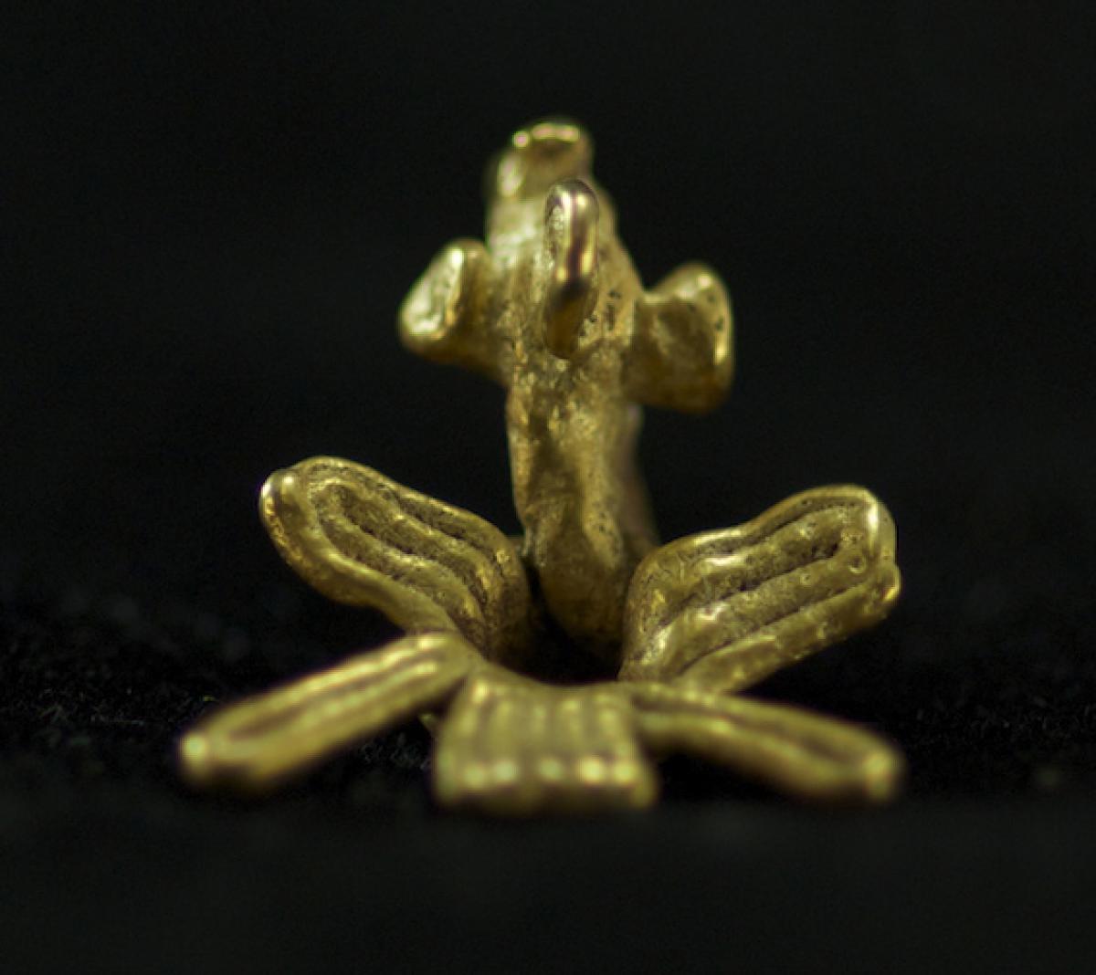 402 - Pendiente figurativo de oro fundido. Representa un ser híbrido de ave y reptil. Este icono fue muy difundido por el Estilo Internacional en el área ítsmico-colombiana. Pertenece a la tumb...